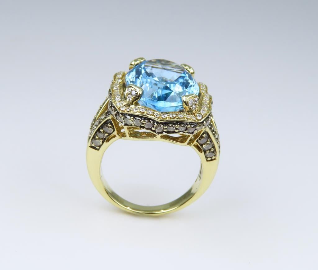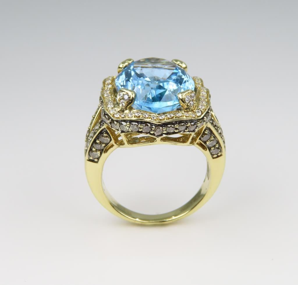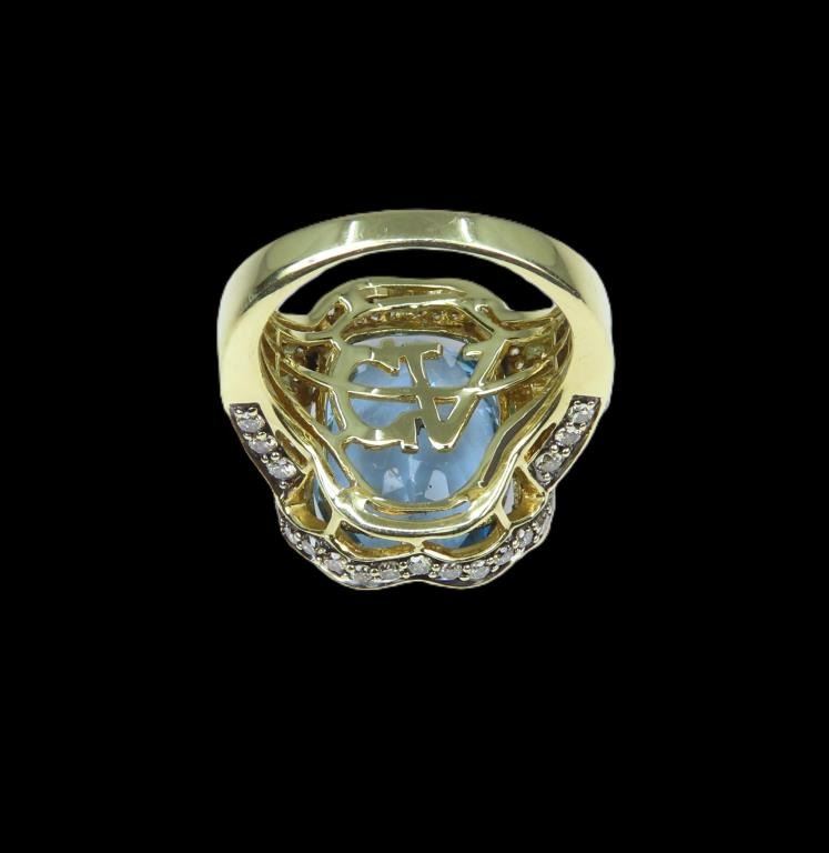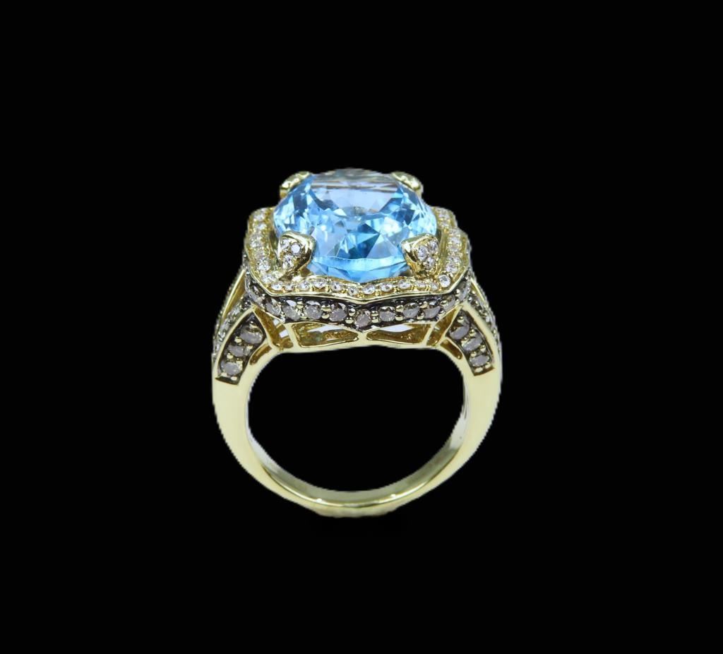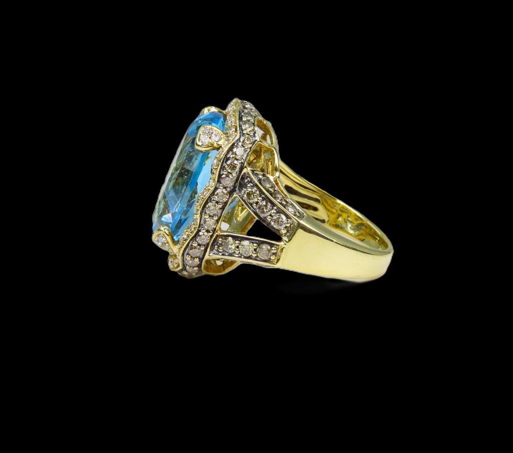 and Diamond Ring featuring a large Swiss Blue Topaz weighing approx. 16.00 carats studded with over 110 pave set Diamonds weighing approx. 1.50-2.00 carats with H-I to light champagne colors and VS/SI clarity beautifully set in a very heavy 14 karat yellow gold custom crafted setting weighing 11.00 grams, ring size 7. Retail $7,000-$9,000.