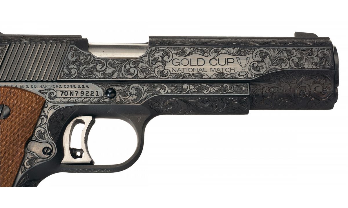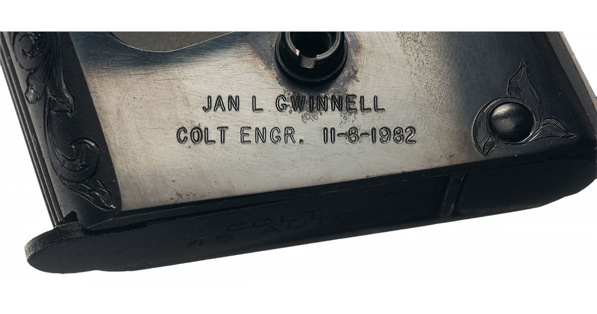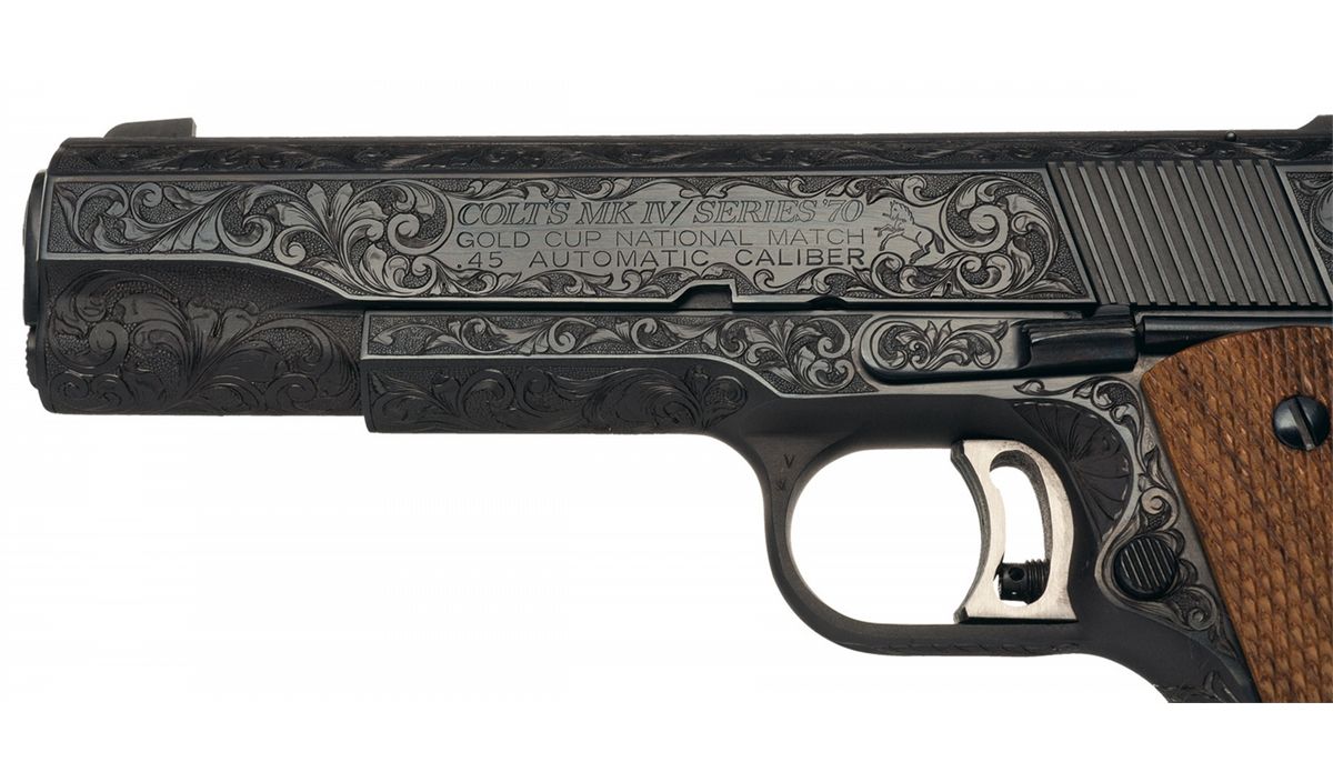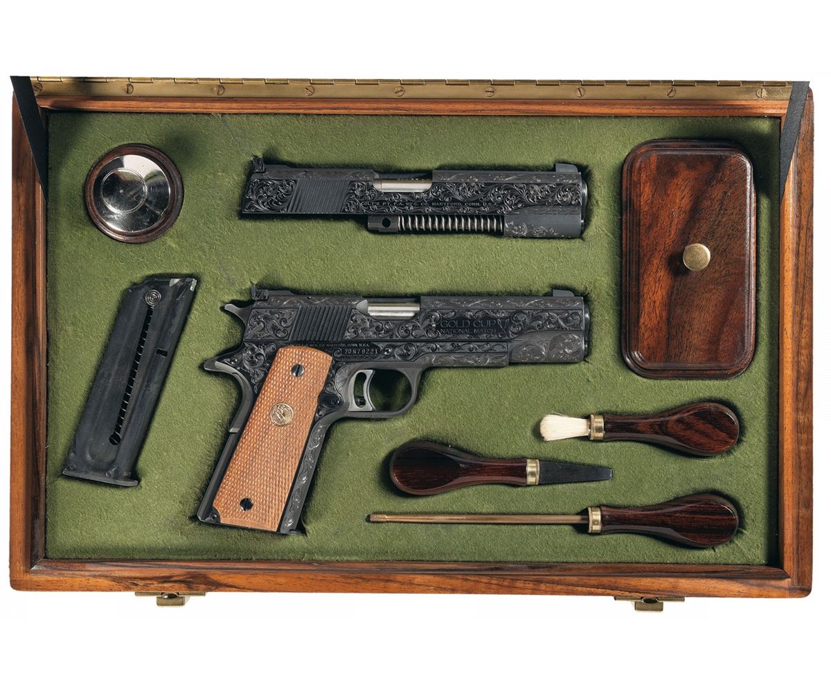 This is an outstanding example of a cased factory engraved Colt MK IV Series 70 Gold Cup National Match pistol. This pistol features beautifully executed broad leaf scroll engraving with a punch dot background covering 95% of the pistol. The slide rib, inside of the trigger guard, back strap and grip safety are the only surfaces not engraved. Surrounded by engraving, the left side of the slide is marked "COLT MKIV/SERIES '70/GOLD CUP NATIONAL MATCH/.45 AUTOMATIC CALIBER" followed by the Rampant Colt and the right side is marked "GOLD CUP/NATIONAL MATCH" followed by the trophy cup. The one line address and serial number are marked on the right side of the frame. The left lower side of the frame under the grip is signed "JAN L GWINNELL/COLT ENGR. 11-8-1982". Blade front and adjustable Elliason rear sights, adjustable serrated trigger, serrated grip straps, Colt marked magazine and fitted with checkered walnut grips with gold Colt medallions. The pistol is complete in a beautiful walnut case with green fitted felt lining. The top of the lid is leather and the inside has a black nylon label with gold "COLT/Custom/COLT'S PATENT FIRE ARMS" and the Rampant Colt. In the case is a complete, assembled Colt 22 LR conversion kit with full coverage floral scroll engraving, standard address and Colt conversion markings on the sides, blade front and adjustable rear sights, nickel oiler, 22 LR magazine, walnut handled brush, cleaning rod and screwdriver. There is also an oak compartment which contains the original hanging tag, keys to the case, extractor and engraved slide stop for the .22 and bushing tool.