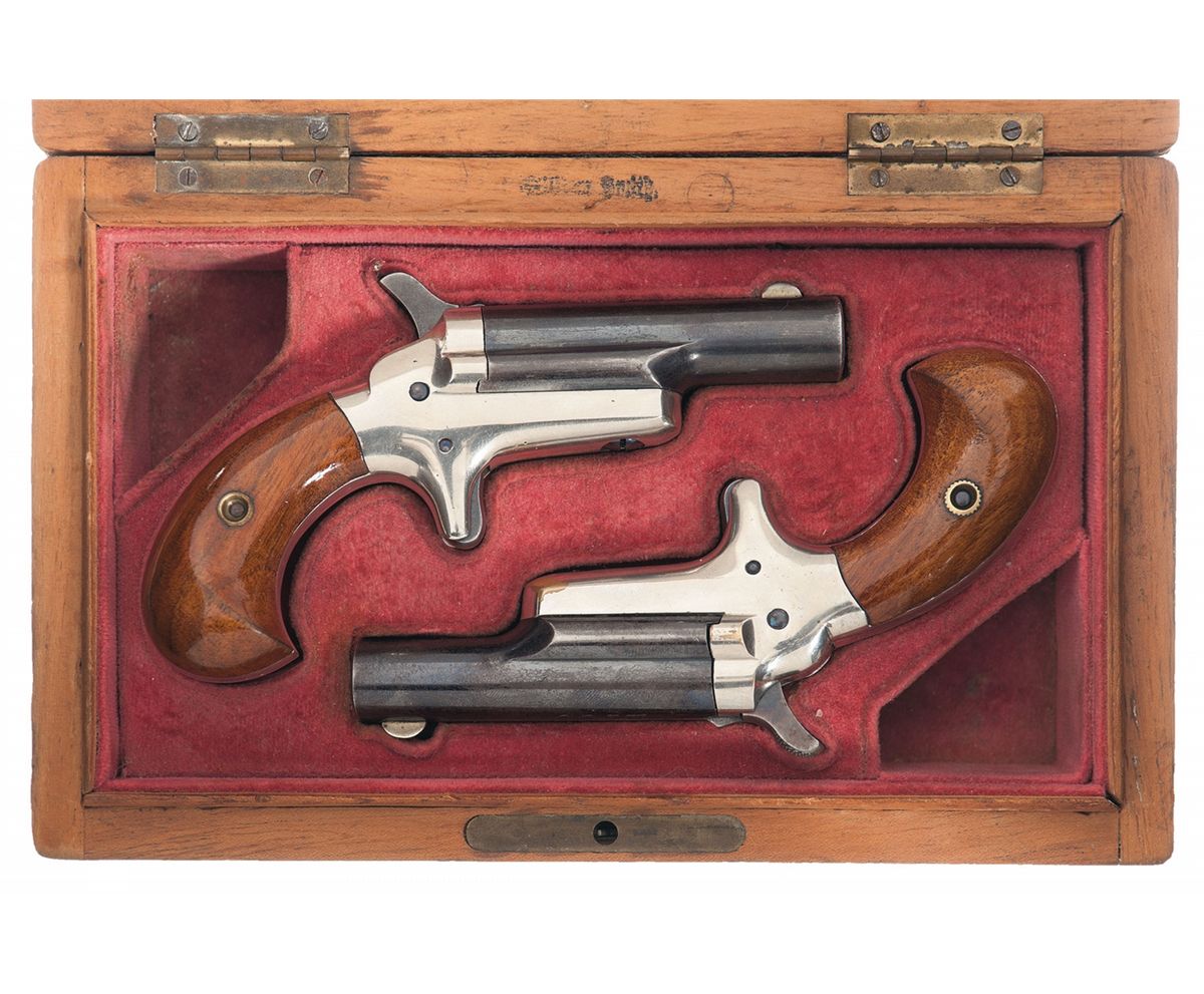 A) Manufactured from 1875 to 1912. The top of the barrel is marked "-COLT-" in large italicized letters and "41 CAL" is marked on the left side of the frame. Serial number is on the left side of the frame under the grip and marked on the inside of each grip panel. Blue barrel, nickel frame, casehardened hammer and trigger, and fitted with smooth varnished grips. Complete in a period wooden case with inset brass shield on the lid and red velvet fitted lining.
