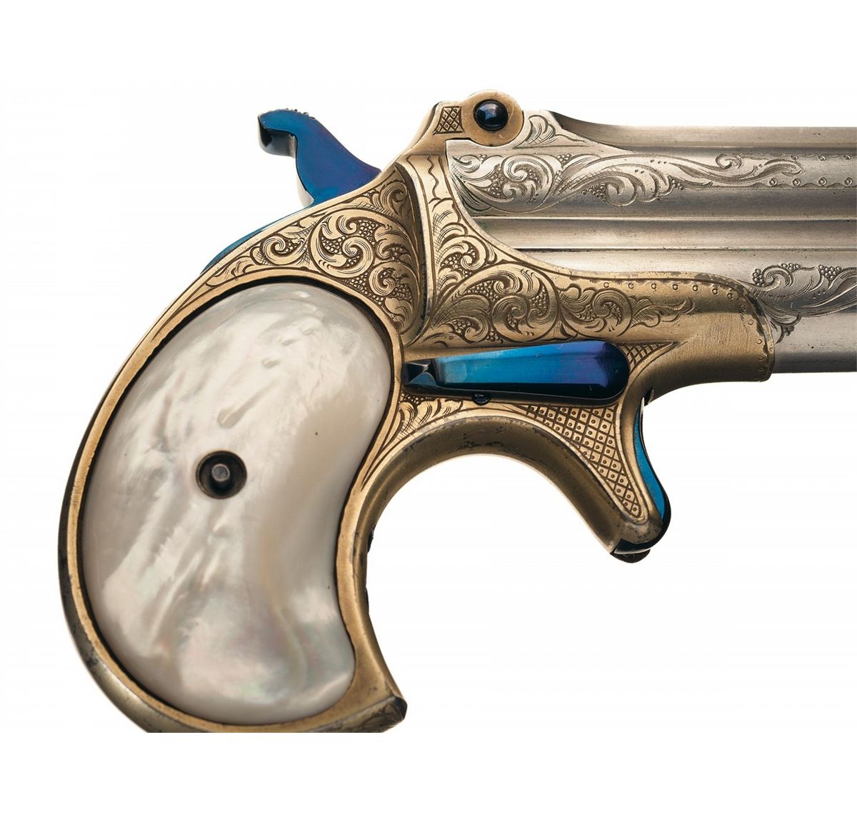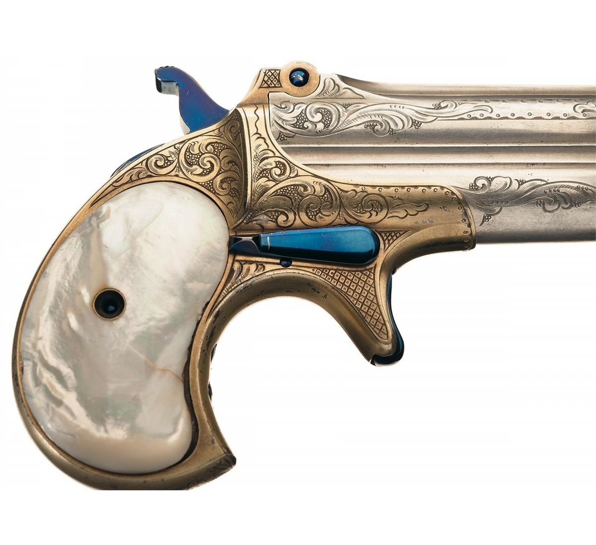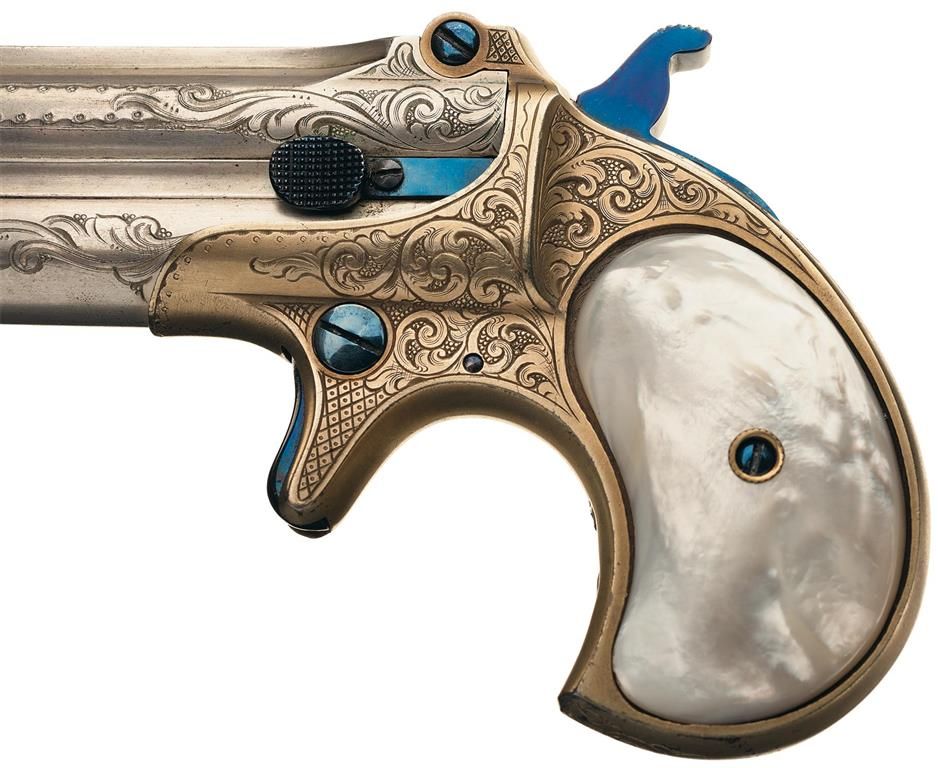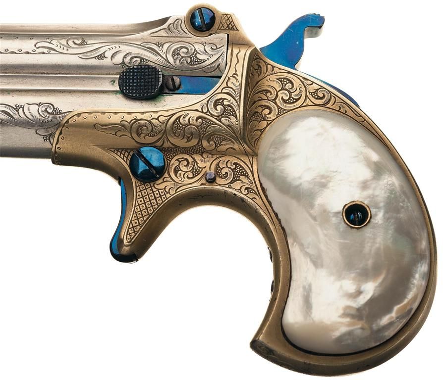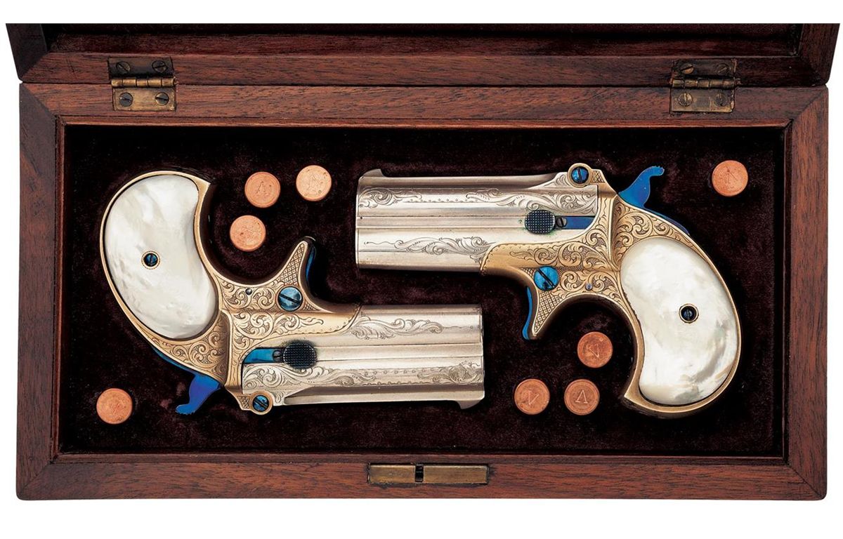 A) This Type II derringer was manufactured from 1888 to 1911. The sides of the barrels are engraved with floral scroll and punch dot designs with a scallop and dot line connecting the patterns on the upper barrel. The frame has the same floral scroll and punch dot design, as well as a diamond and dot design on the upper and lower frame sides. The top of the barrel rib is marked "REMINGTON ARMS Co. ILION, N.Y." The matching serial number is on the bottom of the lower barrel and left side of the frame under the grip panel. The barrels are silver, gold frame and the extractor, screws, hammer and trigger are niter blue. Fitted with smooth pearl grips. The pair are complete in a contemporary wooden case with an inset brass plaque on the lid and brown velvet lining with silver embossed "Remington" on the inside of the lid. In the case are (8) .41 caliber rimfire cartridges with a "V" head stamp.