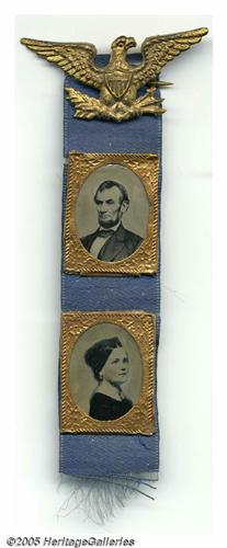 <B>Spectacular Circa 1864 Ferrotype Badge with Abraham Lincoln and Wife Mary Todd</B></I> Many widely-distributed items were produced during Lincoln's Presidency which pictured him with his First Lady, notably cartes de visite. But we have never seen this beautiful form before. Probably sold as a Washington souvenir, or at a public appearance, made by both the Abraham and Mary Todd Lincoln. Individual ferros in "gem" frames are affixed to a blue silk ribbon, with typical Civil War-era eagle pin at top for attachment. In great condition, and a wonderfully unique Lincoln display item. Overall length 3.75". Lot:257