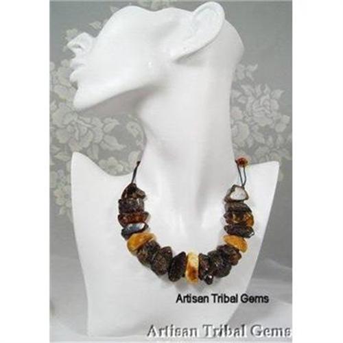 Artisan Tribal Gems invites you to explore the exciting world of Baltic Amber and Ethnic Asian Jewelry. Guaranteed to be exciting, a bit unusual and in some instances VERY unusual, and of course the finest quality! We encourage all our friends to comparison shop to be assured this is the best value on Real Amber! Lovingly created for you by Vera, a devoted Canadian great grandma! Spectacular multicolored amber plates make a very dramatic presentation and this choker is completely adjustable. All hand knotted with the amber ranging from 28mm to 21mm in size. Gram weight is 32. (c-160)