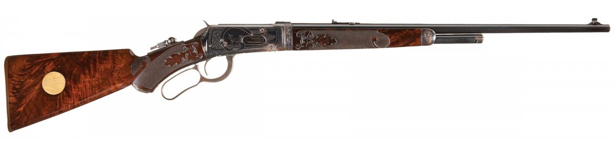 This rifle won the NRA "Ten Best Weapons Award" in 1985, was the "Gun of the Month" in May 1978 issue of "Gun Report Magazine" and is pictured in "THE BOOK OF WINCHESTER ENGRAVING" 2nd edition, by R.L. Wilson. The Cody Firearms Museum letter that accompanies this rifle states that it was shipped from the Winchester warehouse on March 17, 1906. The letter lists the rifle features as 30 caliber, 22-inch round barrel, extra light, plain trigger, fancy wood stock with pistol grip, Lyman rear, leaf and front sights, 1/2 magazine, shotgun butt with rubber buttplate, takedown, and Carved D. The letter describes the engraving and presentation plates as engraved $10.00, round gold plate in both sides of stock - left side engraved monogram "J.R.H.", right side engraved presented to J.R. Haskin by the Westinghouse Employees at Niagara Falls, February 1906. The rifle has a blue barrel, half-magazine, forearm cap and receiver. The hammer and lever are color casehardened. The forearm cap, top of the barrel near the receiver, take-down collar and receiver are engraved with Winchester "No. 6" engraving. The decoration is a scroll border and outline engraving and features a white tail buck in a panel on the right side of the receiver and a bighorn ram in a panel on the left side of the receiver. The forearm and pistol grip stock are highly figured fancy grain walnut with Winchester "Style D" checkered and relief-carved oak leaf and acorns. The stock has a black hard rubber pistol grip cap embossed with "WINCHESTER REPEATING ARMS" and a black checkered hard rubber shotgun buttplate with the Winchester logo embossed in a circle. The stock and forearm have an oiled satin finish. Round gold-plated brass presentation plates are inlaid in both sides of the stock. The 22-inch round lightweight barrel has a Winchester "Express" front sight with ivory bead and a three-leaf folding "Express" rear sight with platinum sight lines. A Lyman folding combination rear sight is mounted on the receiver tang. The top of the barrel is roll-stamped with the legend "MANUFACTURED BY THE WINCHESTER REPEATING ARMS CO./NEW HAVEN. CONN. U.S.A. PATENTED AUGUST 21.1894" in two lines ahead of the rear sight. "NICKEL STEEL BARREL/ESPECIALLY FOR SMOKELESS POWDER" is roll-stamped in two lines on the left side of the barrel below the rear sight. The caliber designation "30 W.C.F." is stamped on the left side of the barrel ahead of the receiver. The Winchester oval, "W/P" proofmark is stamped on the top of the barrel ahead of the engraved scroll work and on the top of the receiver. The serial number, "274574" is stamped across the bottom of the front edge of the receiver. The rifle is complete with the NRA 1985 "Ten Best Weapons Medallion".
