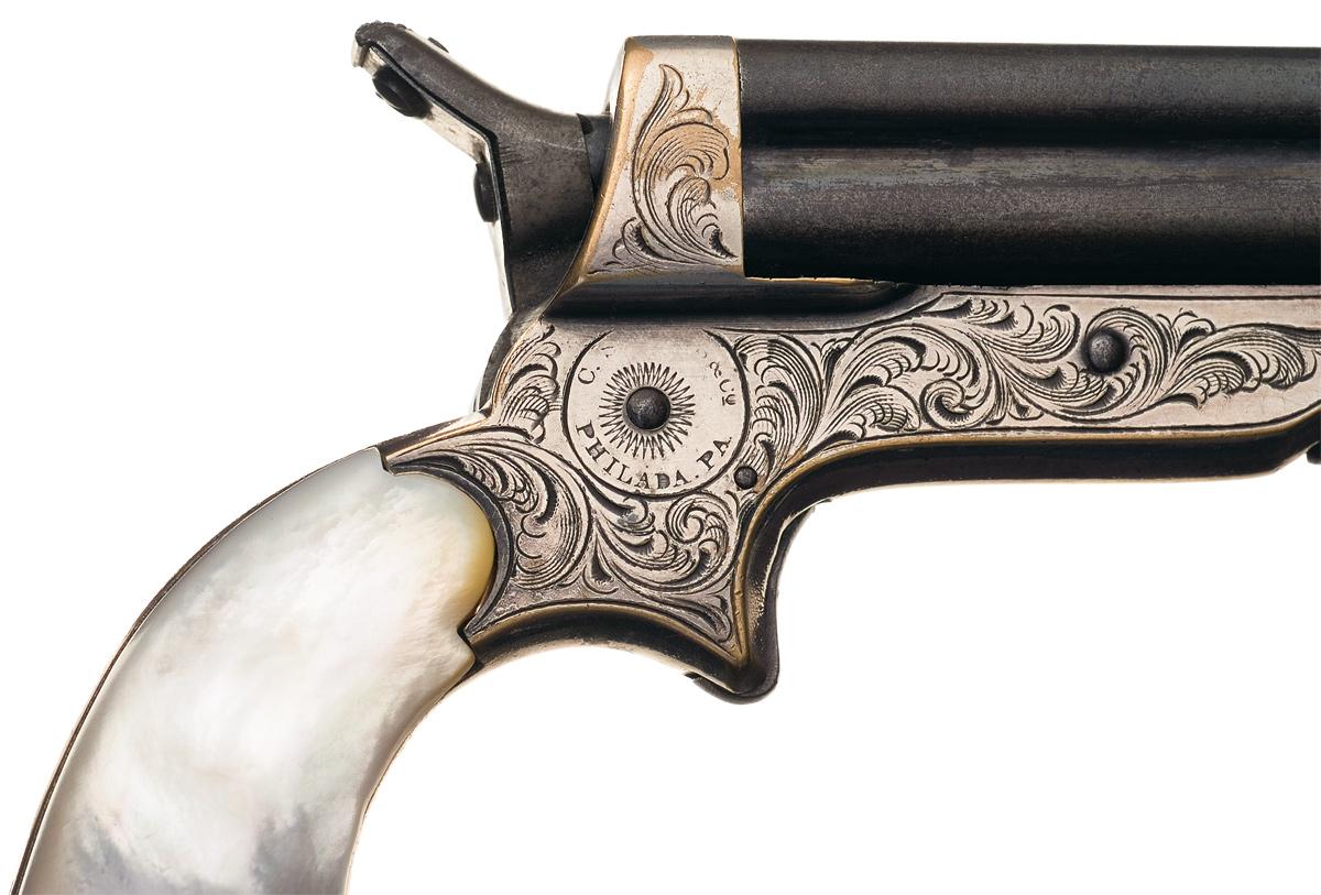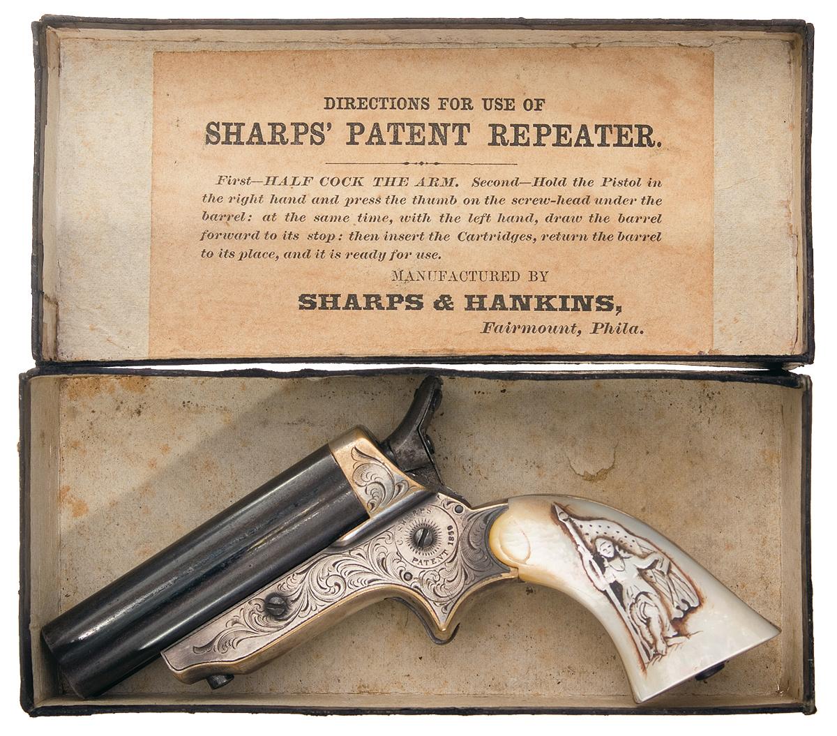Manufactured between 1859 and 1874, with only around 3,700 made. The barrels, hammer, trigger and barrel release are blue and the brass frame is silver plated. The sides of the frame and lower portion of the backstrap are nicely floral scroll engraved, and there is a sun burst around the rear sight notch. The left side of the frame is marked "C. SHARPS/ PATENT 1859" and the right side "C. SHARPS & Co / PHILADA. PA.". Bead front and frame notch rear sights, fitted with pearl grips with a relief carved man holding an American flag on the left side and smooth on the right side. The pistol is complete with an original two piece Sharps black box with the correct directions label affixed to the inside of the lid.
