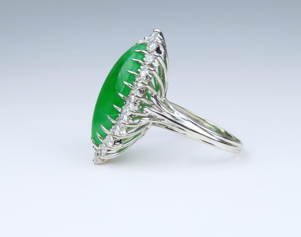and Diamond Ring featuring a marquise shape, intense Apple Green Jade piece weighing approx. 8.00-10.00 carats, measuring approx. 22.00 mm x 10.00 mm in diameter, framed by 22 ‘IDEAL’ cut Diamonds weighing approx. 1.50-1.80 carats with F-G colors and VVS/ VS clarity set in a 14 karat white gold custom made setting, ring size 7. Retail $15,000-$20,000.
