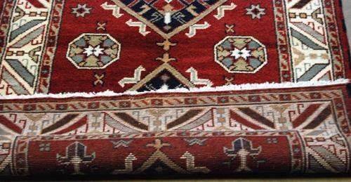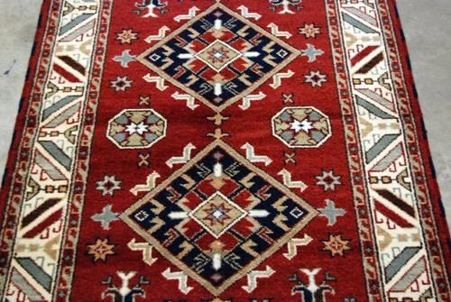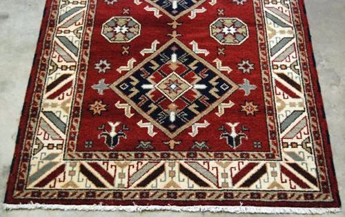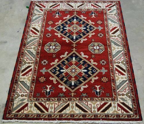 Spectacular geometric design Tibetan rug. Size 4.2 x 6.0 feet, made of fine quality lamb's wool pile on cotton foundation, all natural vegetable dye, and hand woven by skilled carpet weavers in Tibet.
