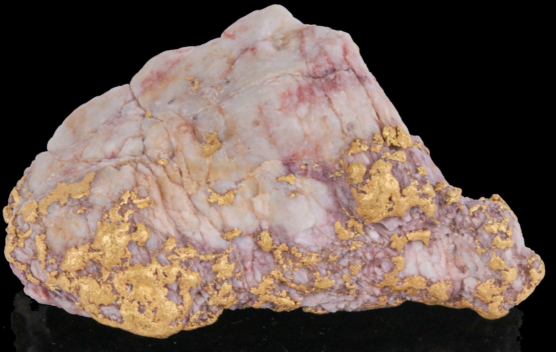 Spectacular 8.4 troy ounce gold in quartz nugget with lots of eye appeal. As it sits in one position, it resembles a sitting frog, reminding me of Sam Clemens' Jumping Frog of Calaveras County. 3.5" x 2" x 1.5" thick. The nugget is perhaps 6 ounces of gold. Its geographic origin is unknown (comes to us from a well-known old California collection), but may have been found metal detecting old dredge/sluice boulder piles.