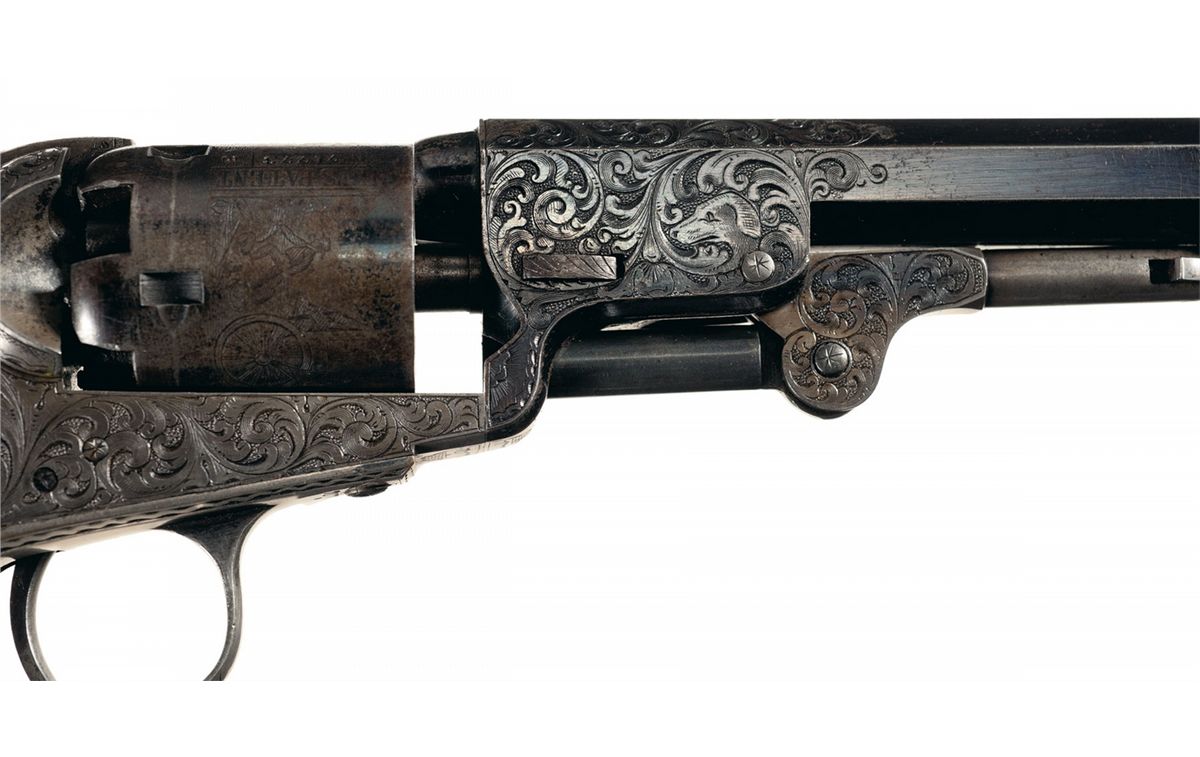 This is an excellent example of a Gustave Young Factory Engraved Colt Model 1849 Percussion Pocket Revolver that was manufactured in 1853. The revolver features the typical high quality scroll and floral engraving and distinctive wolf head hammer engraving from the Gustave Young shop at Colt, most likely this revolver was done by Gustave Young himself. The engraving covers the rear sides and upper flat of the barrel, the frame, rear sides of the loading lever, trigger guard, hammer sides, butt and upper and lower back strap. The top of the hammer ahead of the checkering on the spur is marked with four small dots signifying that it took 4 days to complete the engraving on this revolver. The ends of the wedge and all screw heads are also engraved. There is also a dogs head incorporated in the scroll on each side of the barrel lug. The top of the back strap has a shell design. The top barrel flat is hand engraved "Saml Colt" with a decorative simple double line design around it, the lower left side of the barrel lug is marked "3" and the left side of the frame is marked "COLTS/PATENT" amid the engraving. The cylinder is roll engraved with the stagecoach holdup scene, as well as being marked "COLTS PATENT/No 71773" with a small vertical "3" behind the serial number. The complete matching serial number is marked on the bottom of the barrel, frame, trigger guard, cylinder and back strap with a dot below the latter three, (signifying engraving or special finish), the wedge and loading lever are marked with the partial serial number "1773" and the arbor pin "773". Blue barrel and cylinder, casehardened frame, loading lever and hammer, and silver plated back strap and trigger guard. Fitted with a nicely figured smooth varnished one-piece walnut grip. The revolver is complete with a rare mahogany Kidder case with five compartments, brass corner protectors and brown velvet lining. The top rear of the the case is stamped "MANUFACTURED/SOLELY BY W. KIDDER" and "PATENT, APR 1854.". In the case is an original 1849 Pocket Model dark brown lacquered eagle flask with "COLTS/PATENT" at the top over an eagle with revolver and flask in it's talons. The top is silver and the spring is fire blue, a two cavity brass "COLTS/PATENT" marked bullet mold, an eley Bros cap tin, (sealed in plastic and appears full), an unopened original 6 count box of combustible envelope cartridges, nipple wrench/screwdriver and 10 round lead bullets.