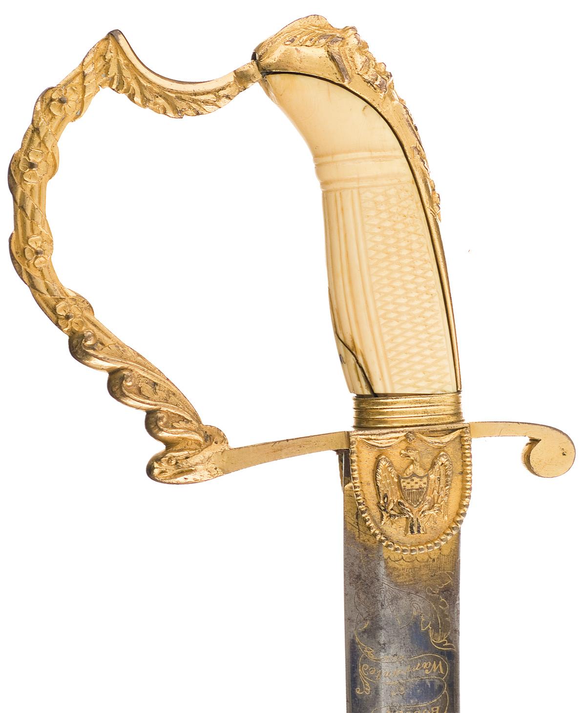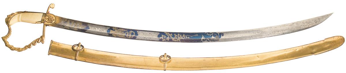 High grade mounted officer's saber made between 1820 and 1840. This style of saber was used primarily by mounted light artillery officers and staff officers. The saber appears to be the product of a high grade English sword maker and is etched with the importer's markings: "R.I. BROWN & Co./BOSTON/Warranted" on the obverse ricasso. The saber has a curved, 32-inch, single edged, blade with a shallow, unstopped fuller. The blade is 1 1/2 inches wide at the hilt. The upper portion of the blade has a fiery, niter blue, finish that ends in a decorative scroll approximately 13-inches from the point. The center of the obverse side of the blade is decorated with a gold-washed eagle and shield and the opposite side of the blade is etched with a stand of colors and military trophies. There are two, bright, acid-etched, panels on either side of the eagle and trophies; three of these panels feature floral designs with dry needle highlight and the fourth is etched with a bow, a quiver of arrows and a liberty cap. Gold-washed floral engraving is located above and blow the acid-etched panels. The hilt is gold-plated with a reverse P knuckle bow, shield-shaped langets and quillion with disk-shaped finial. The langets have relief eagle and shield motifs with beaded edges. The knuckle bow has an eagle-head motif at the base with relief cast floral and ribbon decorations. The top of the pommel has a relief cast eagle with a Federal shield in its talons. The bone grip has checkered panels on either side of the pommel with fluted borders on the center and top. The saber is complete with a gold-plated Hussar style scabbard with narrow drag and two large suspension rings.