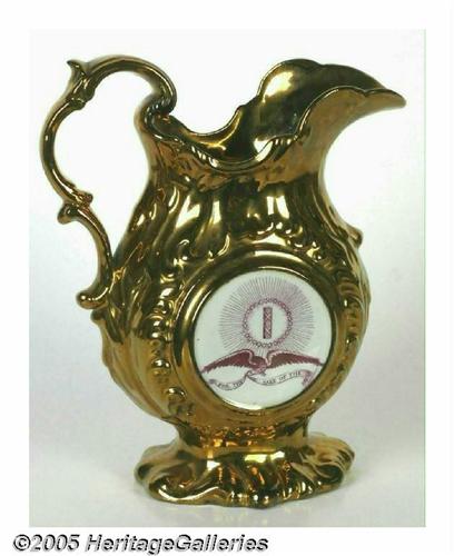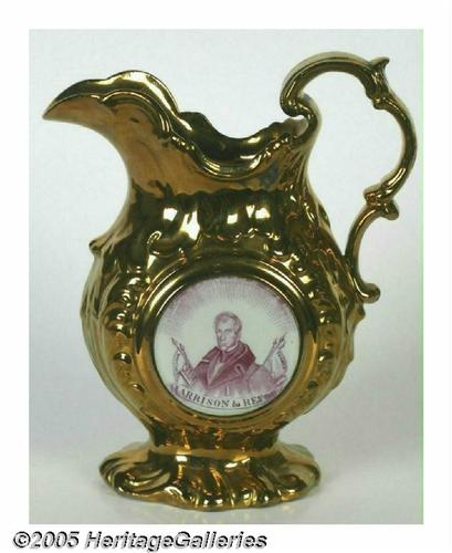 <B>Spectacular, Huge 1840 William Henry Harrison Copper Luster Pitcher</B></I> At 9.5" tall this is the largest and most massive example of this style which we have seen! Except for a tiny trace of surface oxidation on the upper rim, this piece is essentially <I>mint</B></I>; surely unimprovable condition. There is a slight smudge on the word "Reform" below Harrison's bust; but this occurred in manufacture. Harrison copper lusters have always been scarcer than those of Jackson, the other candidate for whom they were made, and this is especially true of this massive size. A somewhat smaller example, with log cabin instead of eagle reverse, recently sold for nearly $8,000 in a Chicago-area auction. A special opportunity for the early 3-D collector who wants the very best! Lot:256