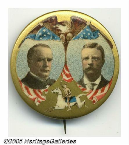<B>Spectacular Large 1 3/4" Multicolor Jugate for McKinley and Roosevelt</B></I> Considered one of the most beautiful of all jugate button designs, it also features a Rough Rider on a white horse below the two portraits. This is a variety notoriously prone to foxing and spotting; at least 3/4 of the examples we have seen over the years are imperfect. The present example is as choice as any we have encountered, in essentially unimprovable condition. Contributing to the effect is dead-on perfect centering, rarely found on this variety. An outstanding "type" example for this popular ticket, which includes not one but two presidents, as Theodore Roosevelt would assume the office upon William McKinley's 1901 assassination. Lot:260