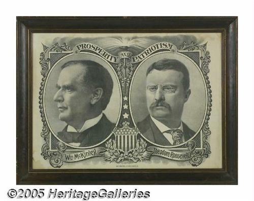 <B>Spectacular Large 1900 William McKinley - Theodore Roosevelt Jugate Poster</B></I> Add color to this dramatic design and you have a $5,000 poster! Printed by the legendary William B. Burford Lithographers of Indianapolis, which produced the best black and white political poster designs of the 1880-1900 era. Trivial light water stain in lower left hand corner and along top edge detract minimally, but must be noted (almost certainly could be cleaned if one felt the need). Otherwise this beauty is near-mint. Very nicely presented in vintage-look custom frame. 34" x 24" as framed. Lot:260