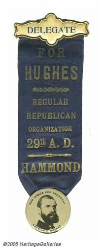 <B>Spectacular Large 1916 Charles E. Hughes for President Badge</B></I> Some 8.25" overall length, with a dramatic 1 3/4" "Our Choice for President Charles E. Hughes" button suspended at bottom. Once you get past a few common, nationally-distributed varieties, Charles Evans Hughes presidential buttons are very tough, especially in this large size. Condition is beautiful but for a trivial partial horizontal separation in the ribbon just above the button. What a centerpiece for this difficult candidate! Lot:262