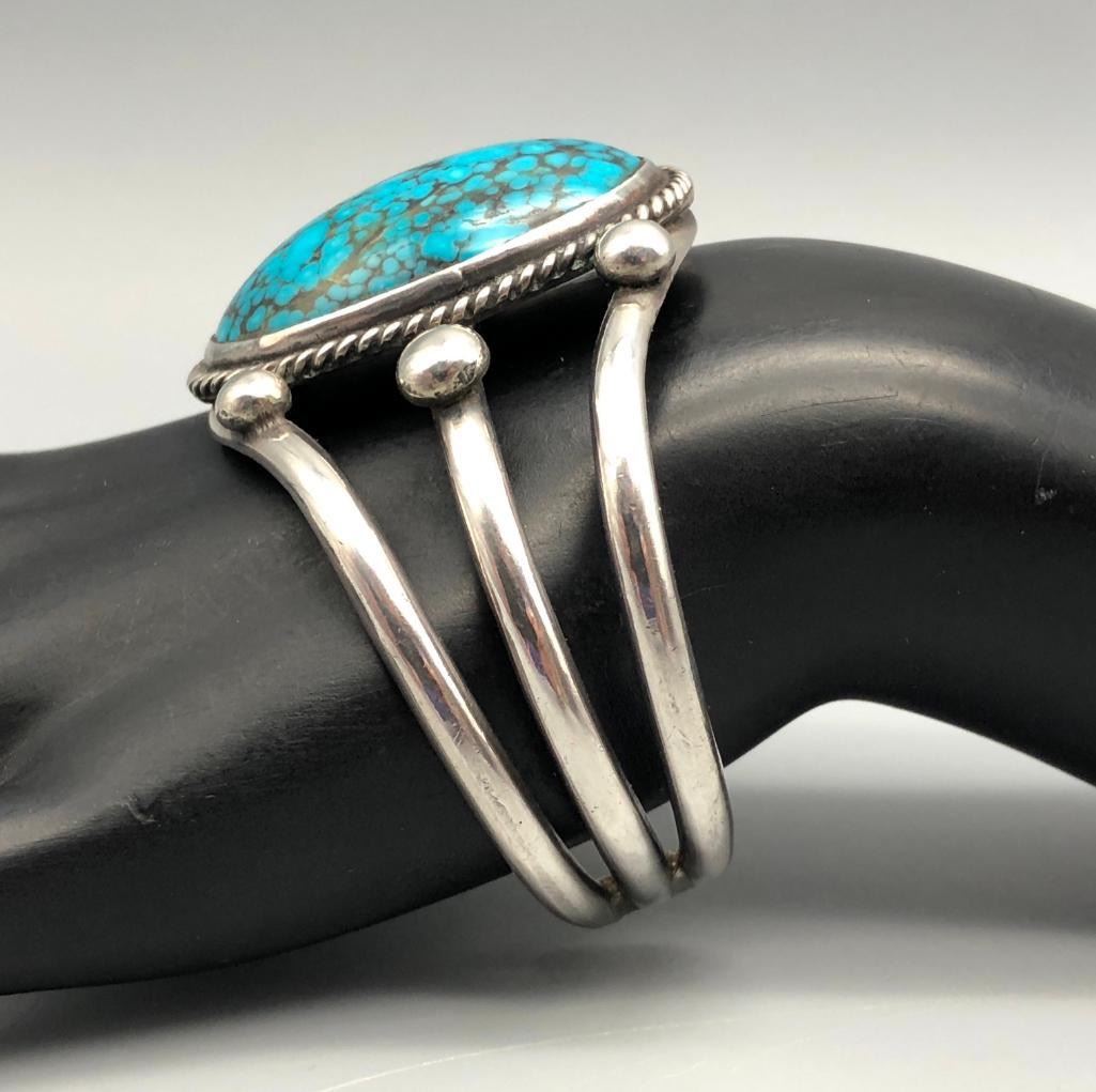 For sale in this lot is a spectacular large Spiderweb turquoise bracelet. This gorgeous bracelet is set with a fabulous, large Spiderweb turquoise cabochon, around the stone is twisted wire with large silver dots. It also has a split shank design and is made from sterling silver. MAKER: Unmarked. APPROX AGE: Circa 1970s. SIZE: Inside circumference measures 5-1/2 inches long. Opening is an additional 1-1/2 inches, fitting a 7 inch wrist. Width is 1-5/8 inches. Weighs 62 grams. CONDITION: Good for its age, normal wear expected. Please look closely at the pictures as they are an important part of our description and are hereby incorporated into the description, specifically with regards to condition. SHIPPING: There will be a $5 handling / packaging fee for shipping this lot. The actual cost of postage will be added on top of that. BUY IT NOW: If you would like to buy this item now, without waiting for the auction day to bid on it, we do offer this option (which is available up to 48 hours before the actual auction starts). The “Buy it Now” price is the high estimate of this lot (plus applicable fees and the Buyer's premium is discounted to 10% when using the Buy it Now option). If you would like to exercise this option, you must contact us by email (or phone as long as you talk to someone live). Reference this lot number and your intention to "Buy it Now."
