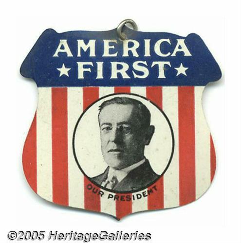 <B>Spectacular Large Woodrow Wilson Die-cut Celluloid Pin, the Largest We Have Seen of the Type</B></I> With a surface area literally four or five times larger than typical examples of the type, this bold red white and blue beauty makes quite a statement. Almost certainly a 1916 campaign item, with this slogan (wouldn't the Hughes mate be nice?). Choice condition, with original pin attached for wearing. We have never seen this variety before. Lot:262