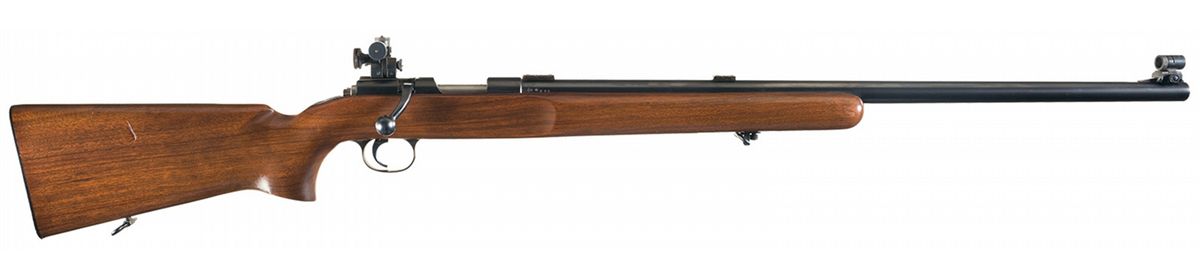 This rifle is equipped with a Redfield front globe sight and adjustable rear receiver sight. Scope mounting bases are mounted on the heavy barrel. All parts are blue except for the bolt which is bright. Detachable magazine and a one-piece smooth pistol grip stock. An adjustable sling ring is mounted on an inset rail at the front of the forearm and the buttplate is finely checkered metal. The Model 37 was manufactured from 1937 to 1940.