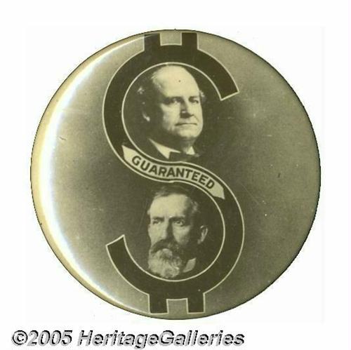 <B>Spectacular One-of-a-kind 1908 William Jennings Bryan - John Kern Jugate Button</B></I> One of the most striking jugate designs we have ever seen, with the candidates' portraits contained within a dollar sign marked "guaranteed." Almost certainly this is the only known example; we have certainly never seen or heard of another. The photo quality of the images and the rich, subtle shading make this one of the most beautiful, elegant non-color designs we have ever encountered. Pristine condition is the icing on the cake. A very special opportunity for the advanced celluloid collector or Bryan specialist. Size is 1 1/4". Lot:260