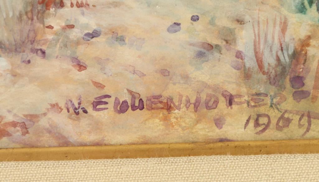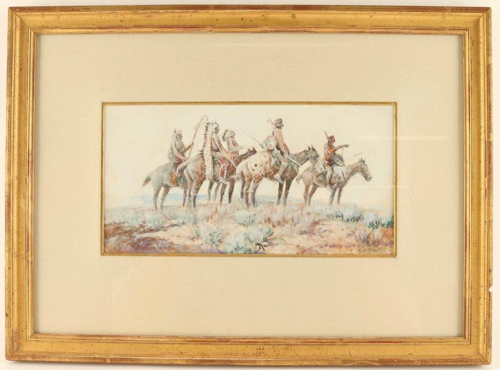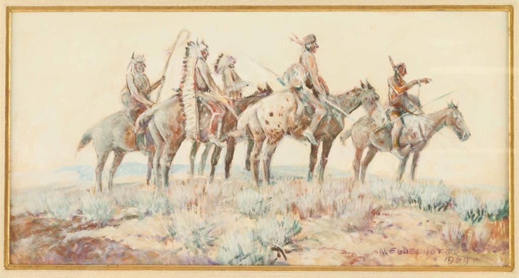 by noted western artist Nick Eggenhoffer entitled Plains Scouts. Measure 6.5"x11". Provenance purchased by Harold McCraken directly from the artist then sold to Roy Anderson who sold it to our consignor. Bio-Nick Eggenhofer was born in Gauting, southern Bavaria, Germany in 1897. He grew up in Germany, familiar with horses and playing "Cowboys and Indians" at the same age as children in America, due to a European craze inspired by Buffalo Bill's continental tours with his Wild West show. He also saw Western movies and Remington and Russell works reproduced in German magazines. He came to New York in 1913 and began four years of night classes at Cooper Union and held a variety of jobs including an apprenticeship at the American Lithography Company. Eggenhofer decided to become a Western artist, preparing by making scale models of wagons, stagecoaches, and other props for his paintings. His first illustration was sold in 1920 to Western Story Magazine of Street & Smith, the pulp publishers. In 1925 Eggenhofer married and traveled out west in a model T. Even then he saw a ten-horse trader and mail delivered by buckboard. Inspired by his travels, he began doing illustrations for many Western books and magazines. In 1961 he wrote and illustrated his own book Wagons, Mules and Men. In the early 1960's, Eggenhofer moved to Cody, saying "The West got hold of me at a very early age and hasn't turned loose yet." He is in the forefront of those who portray the wagon-train era of America and has won top prize at the Cowboy Hall of Fame. In 1971 it was said that he had made more than 30,000 illustrations. Eggenhofer was both a member of The Cowboy Artists of America and the National Academy of Western Art. He died in Cody, Wyoming in 1985 at the age of 88. His works are held by the National Cowboy Hall of Fame and many important private collections.