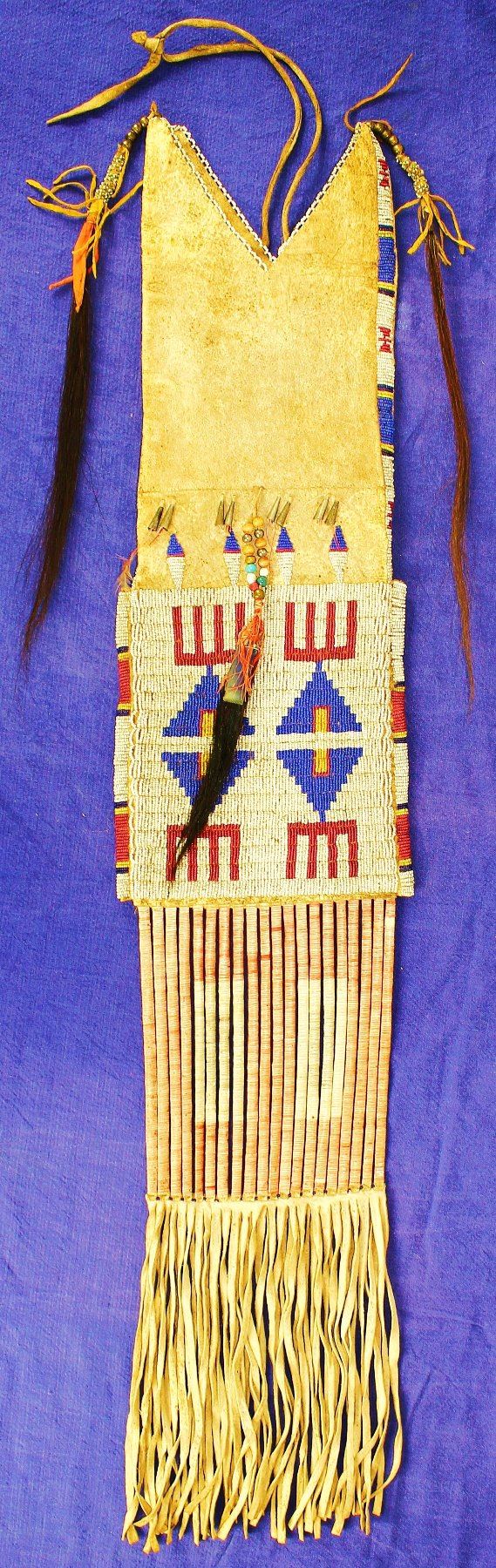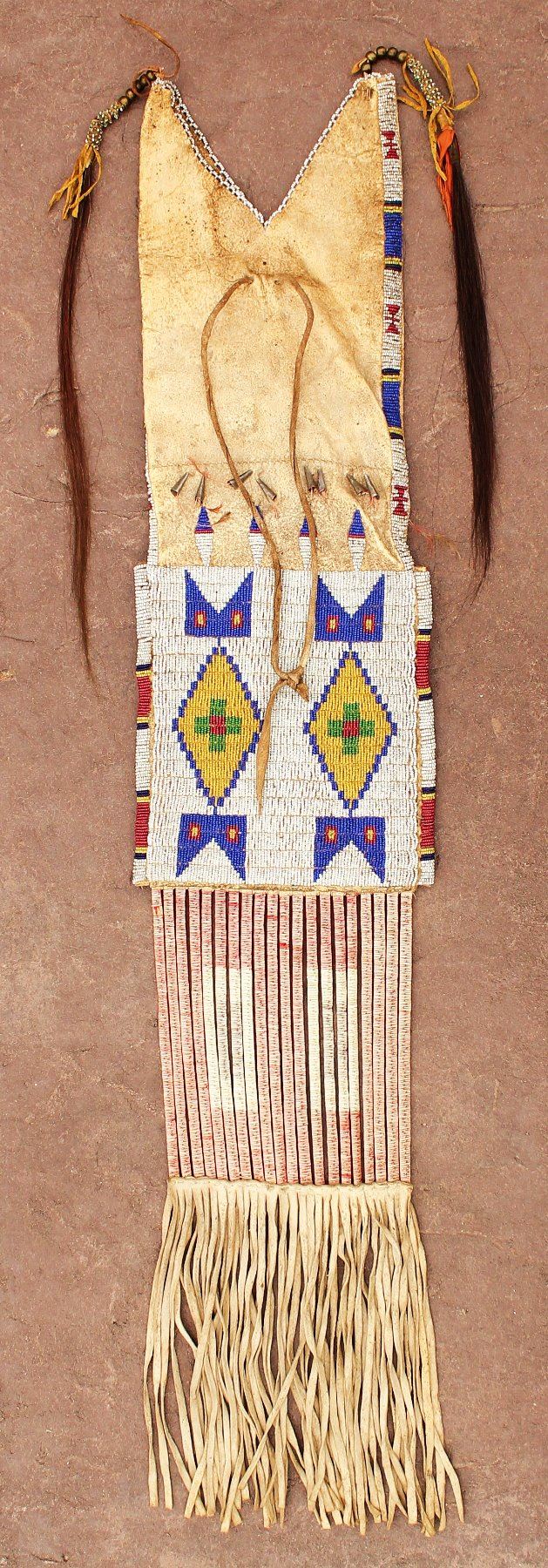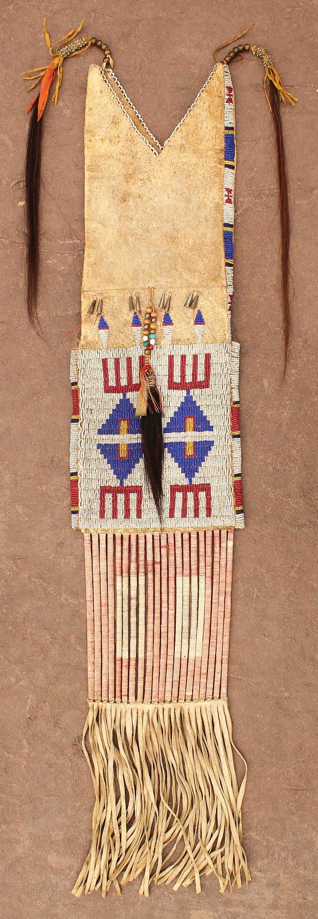 Massive early pipebag with split tongue top, hair drops, and hair trophy. With wonderful bead pattern that includes bear claws and eagle feathers and long quilled panel. Measurements; 8" x 39".