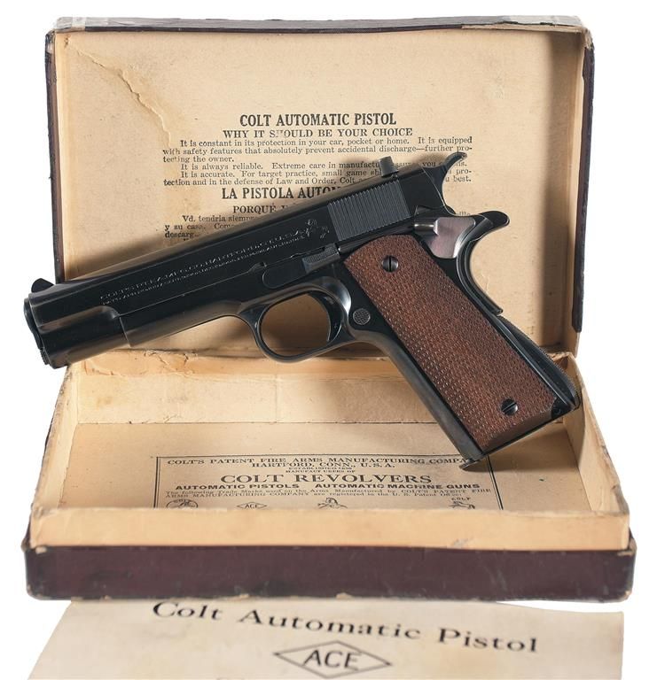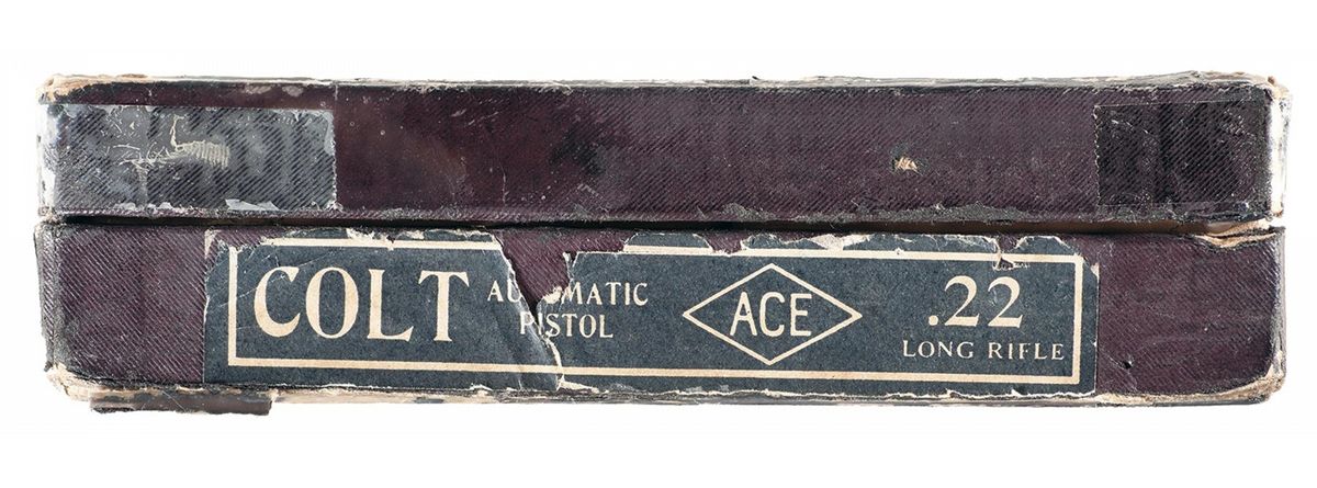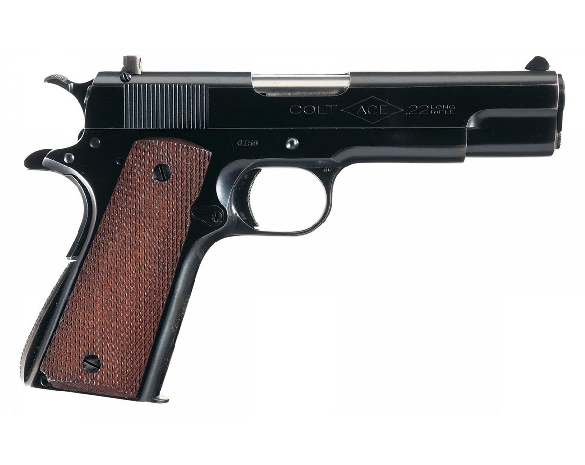 This is an exceptional example of a Colt Ace Model that was manufactured in 1936. The slide retains the original front blade and adjustable rear sights and is marked on the left side with the elongated two line address/patent dates followed by the Rampant Colt. The right side is marked with the distinctive "COLT" followed by "ACE" in a diamond followed by "22 LONG/RIFLE". The right side of the frame is marked with the serial number and the upper left front of the trigger guard is marked "X" over the "VP" triangle proof with "60" on the opposite side. The pistol has the original checkered trigger, slide stop, magazine release, thumb safety, wide hammer and arched mainspring housing. Two tone magazine marked on the bottom of the base "COLT/ACE/22 L.R." and is fitted with checkered walnut grips. Includes the factory hinged lid maroon box with matching number on the bottom and an original instruction sheet.