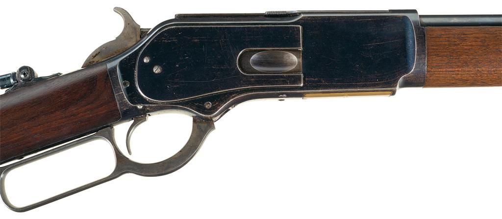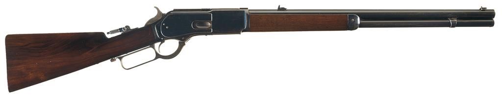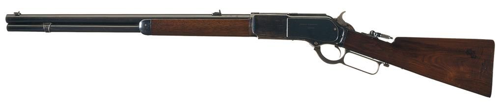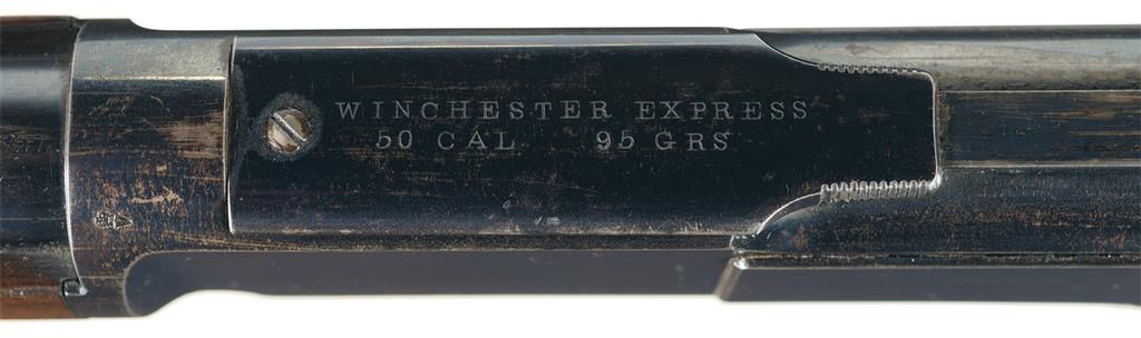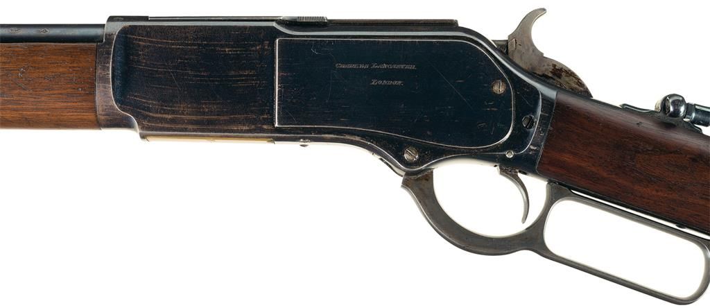 Rare special order, Winchester Model 1876 Short Rifle chambered for the .50-95 Express cartridge. This rifle was manufactured in 1879 and has British proof and inspection marks stamped on the barrel and receiver and British dealer marking engraved on the left side plate. The rifle has the late Second Model receiver with screw fastened dust cover guide rib and dust cover with serrated finger guides. The rifle has a blue finish with casehardened hammer, trigger and lever and straight grain American walnut stock. The 22 inch round barrel has a gold-plated Beach folding combination front sight and rare Winchester Express rear sight with one fixed and four folding leaves. The fixed leaf has a bright sight line and is graduated for 100 yards; the folding leaves are graduated for 150, 200, 300 and 400 yards. A Lyman folding combination rear sight is mounted on the upper receiver tang. In addition to the special order 22 inch barrel, front, rear and tang sights, the stock has a special order, blued steel, shotgun buttplate. The rifle was originally shipped with a half magazine, but is a full magazine, which is of the period. The top of the barrel is roll-stamped with the two-line legend: "WINCHESTER'S-REPEATING-ARMS. NEW HAVEN. CT./KING'S-IMPROVEMENT-PATENTED-MARCH 29. 1866. OCTOBER 16. 1860." ahead of the rear sight. ".50 CAL." is roll stamped on the top of the barrel just ahead of the receiver. British proof and inspection marks are stamped along the left side of the barrel below the rear sight. The top of the dust cover is roll-stamped: "WINCHESTER EXPRESS/.50. CAL. 95 GRS." in two lines. The British dealer's marking: "CHARLES LANCASTER/LONDON" is engraved in two lines on the left side-plate. A London "Crown/V" inspection mark is stamped on the upper left side of the receiver. "50-95" is stamped in script numerals on the bottom of the cartridge elevator and the serial number "14063" is stamped in script numerals on the lower tang behind the lever latch.