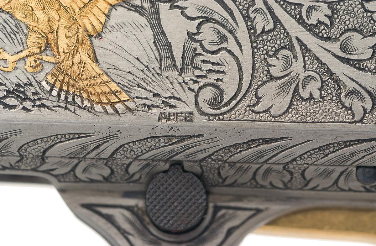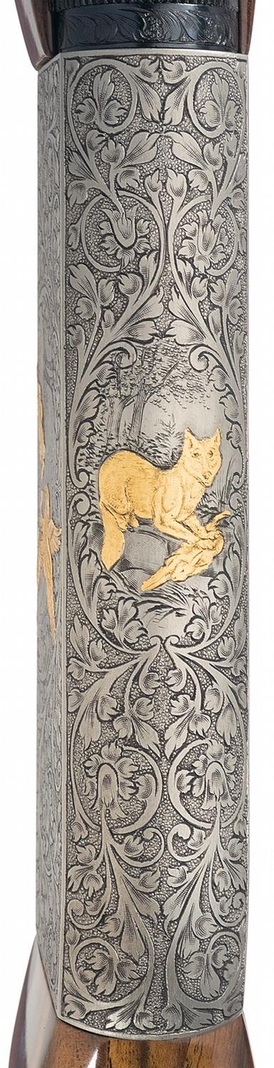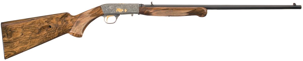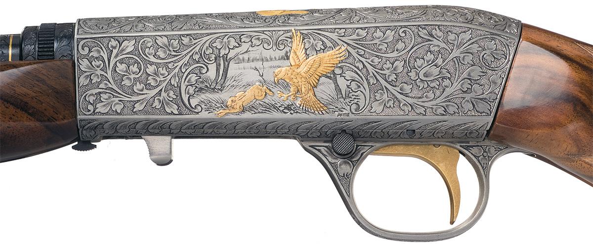Manufactured in 1969, this Browning rifle features a blue barrel and satin grey receiver. The receiver features floral vine engraving with a punch dot background. The left side has a gold inlaid hawk attacking a gold inlaid rabbit in a field scene, the right side has a gold inlaid bobcat and quail in a field scene and the top has a gold inlaid fox with its front paws on a dead gold inlaid rabbit. The left side of the receiver is signed "ABEE". The takedown ring is engraved with a punch dot background, and there is a thin gold inlaid band and simple leaf engraving around the muzzle and breech ends of the barrel. Standard barrel markings with a blade front sight with brass bead and adjustable folding single leaf rear sight and gold washed trigger. Mounted with an Exhibition Grade high gloss checkered English walnut forearm and pistol grip stock.