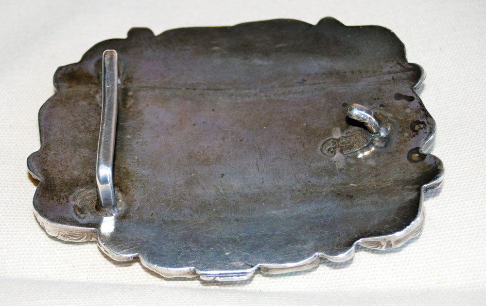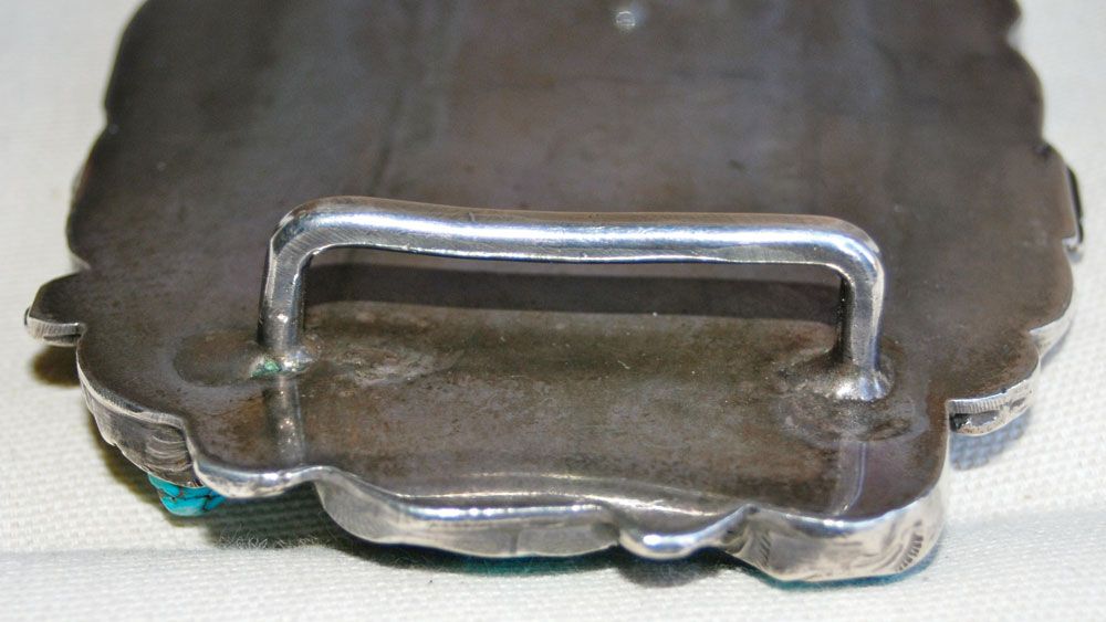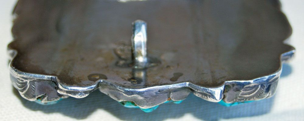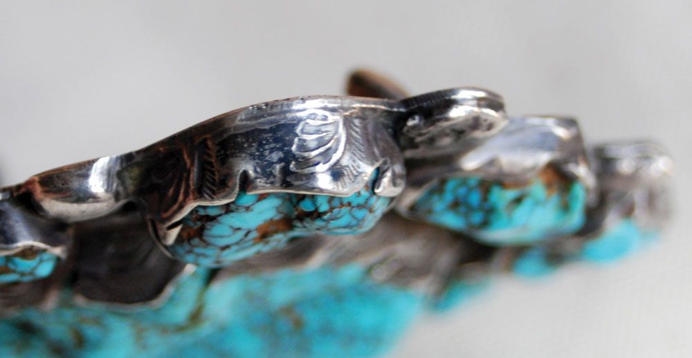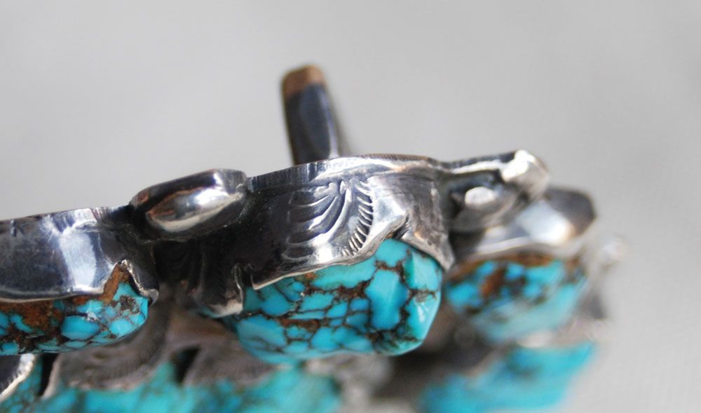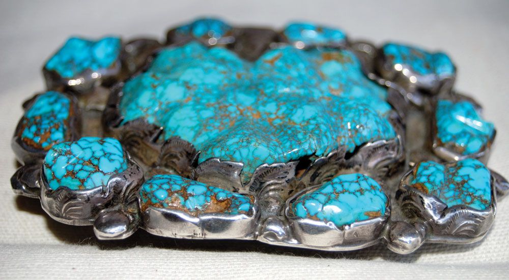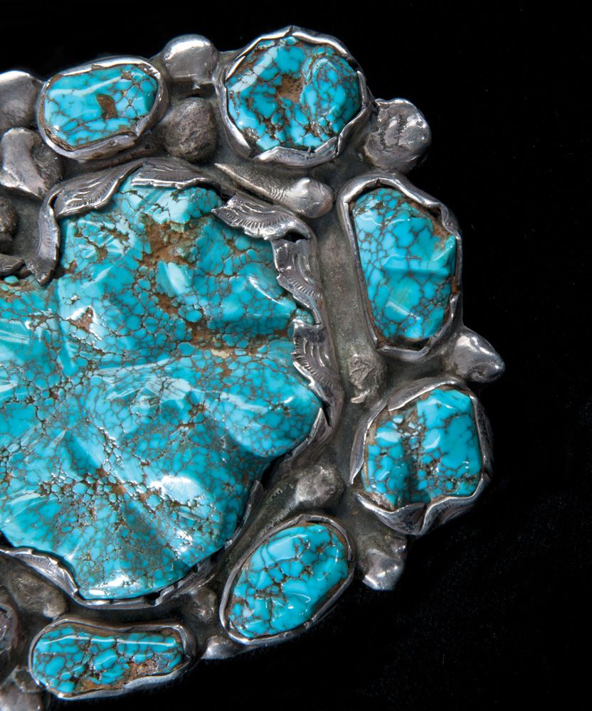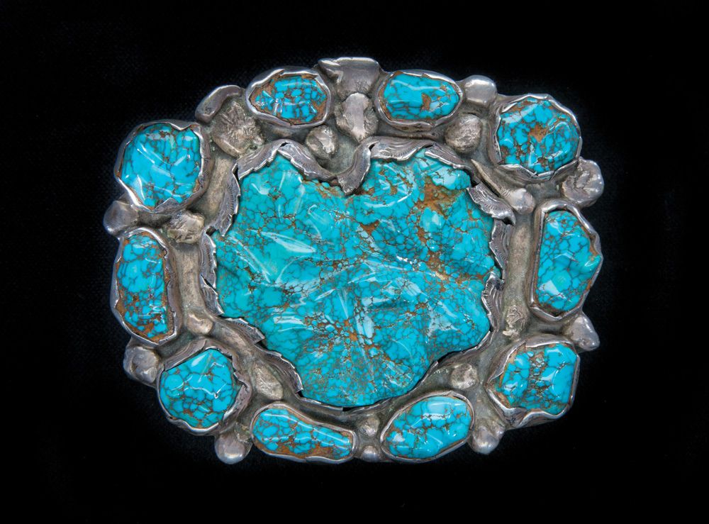 Impressive, 3 3/4” x 4 3/4” overall, Lander Country (Timberline or Nevada Blue) center stone of approximately 300 carats, surrounded by 10 smaller stones of approximately 15-30 carats each. No hallmark, but clearly the work of the Simplicio family (Dan or Mike). Stamped silver that has been cut-out in a leaf pattern, with silver raindrops. Circa 1960s.
