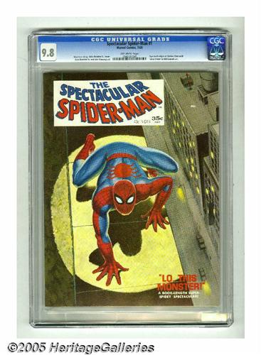 <B>Spectacular Spider-Man #1 (Marvel, 1968) CGC NM/MT 9.8 Off-white pages.</B></I> This Marvel experiment with a magazine format only lasted two issues and reportedly didn't sell well at the time. But collectors of today certainly appreciate it, especially since it has a John Romita Sr. cover, with interior art by Romita and Jim Mooney. Plus there's an update of Spider-Man's origin, with Larry Lieber and Bill Everett art. Overstreet 2005 NM- 9.2 value = $160. CGC census 1/05: 2 in 9.8, none higher. <I>From the collection of Chris Bell.</B></I>