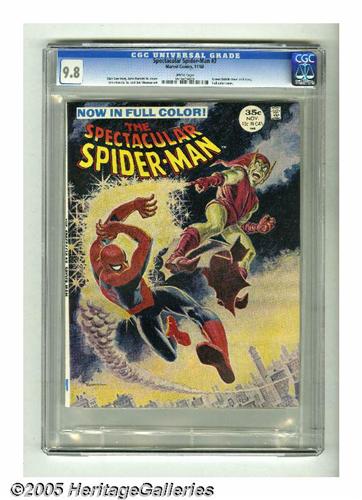 <B>Spectacular Spider-Man #2 (Marvel, 1968) CGC NM/MT 9.8 White pages.</B></I> This magazine wasn't a big seller when Marvel brought it out, but its two-issue run is sought after these days, particularly this second issue with its superb painted cover by John Romita Sr. The interior art's by Romita and Jim Mooney. Overstreet 2005 NM- 9.2 value = $180. CGC census 2/05: 29 in 9.8, none higher. <I>From the collection of Chris Bell.</B></I>