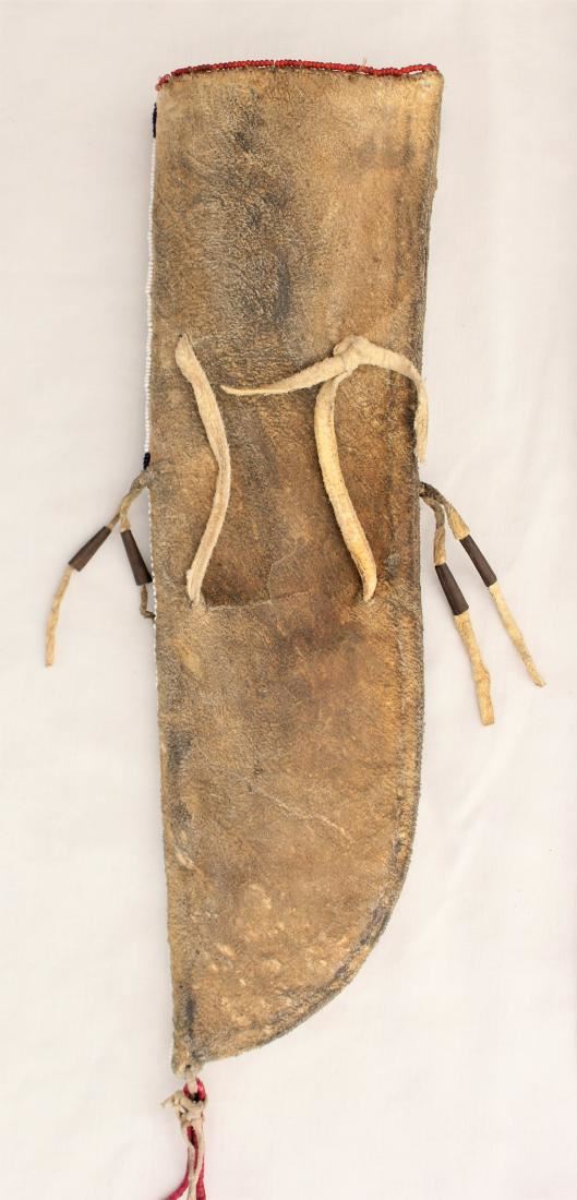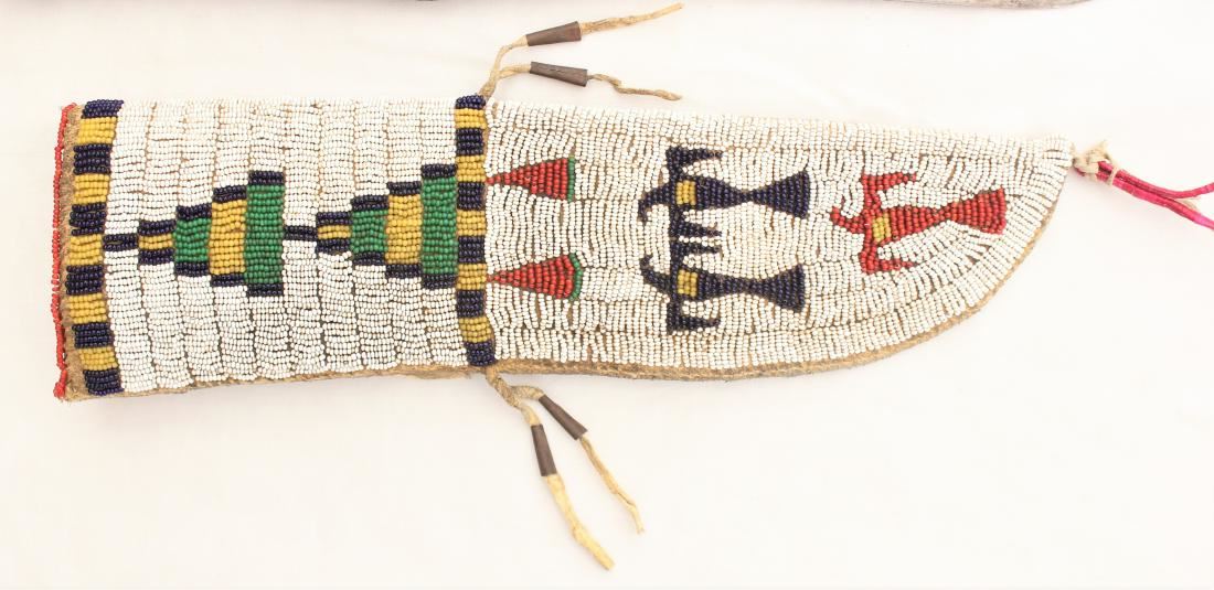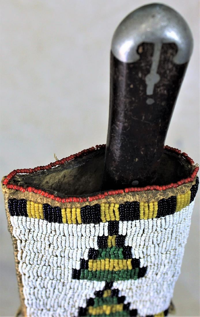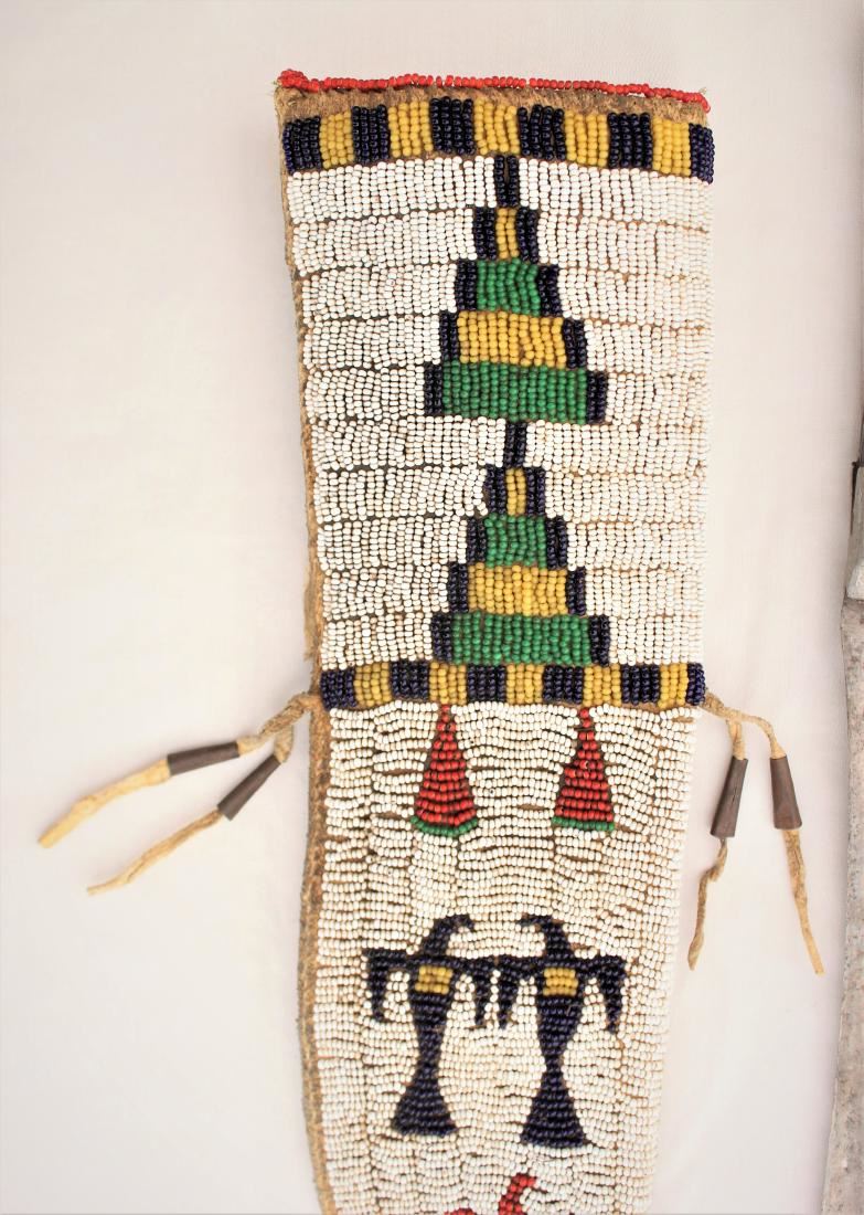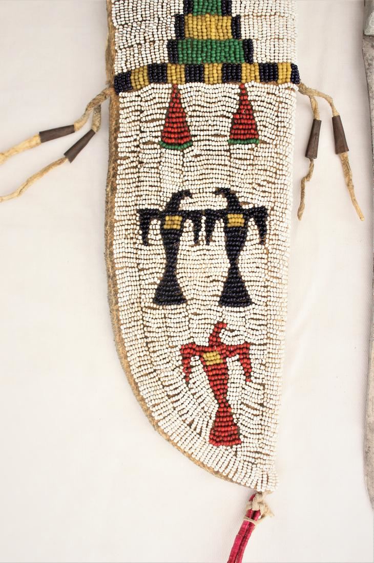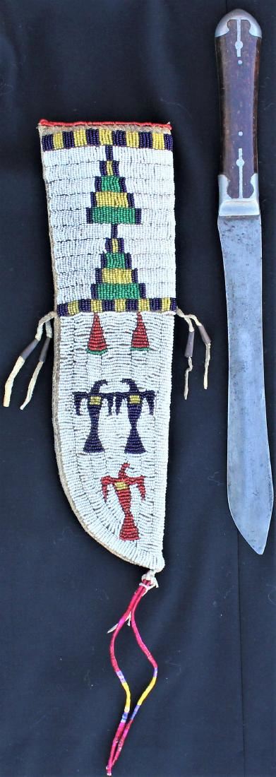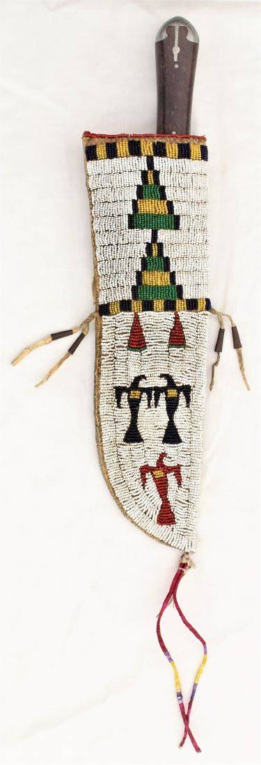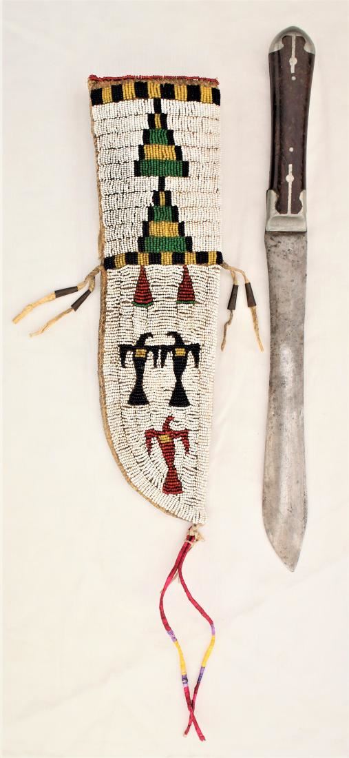 Huge 19th Century masterfully beaded Northern Plains Indian knife sheath which focuses on three thunderbird symbols, that measures 3 1/2"x 12". A superb example of North American Indian's Object of Art. The Thunderbird symbol, spiritual in nature, represents the great eagle, which culminates the powers of the Creator, Destroyer, and the Controller of Nature. With its panoramic veiw, the Thunderbird could see all, and veiw the world from on high. It depicted wisdom from which prophesy and calculated power was sourced from. As with the eagle feather headdress, this sheath must have been worn by a powerful warrior, or medicine man. It is in beautiful condition, comprised of early beads, and a pleasingly patinaed back. Includes a large period knife.