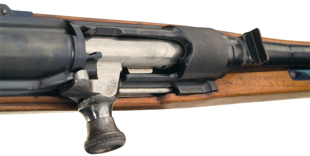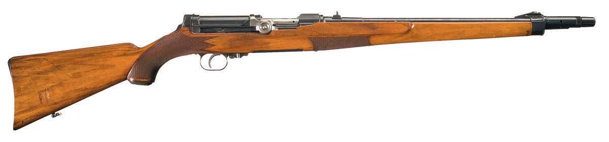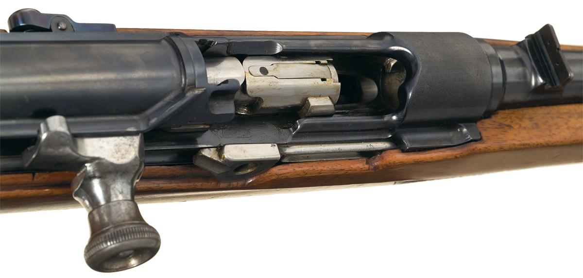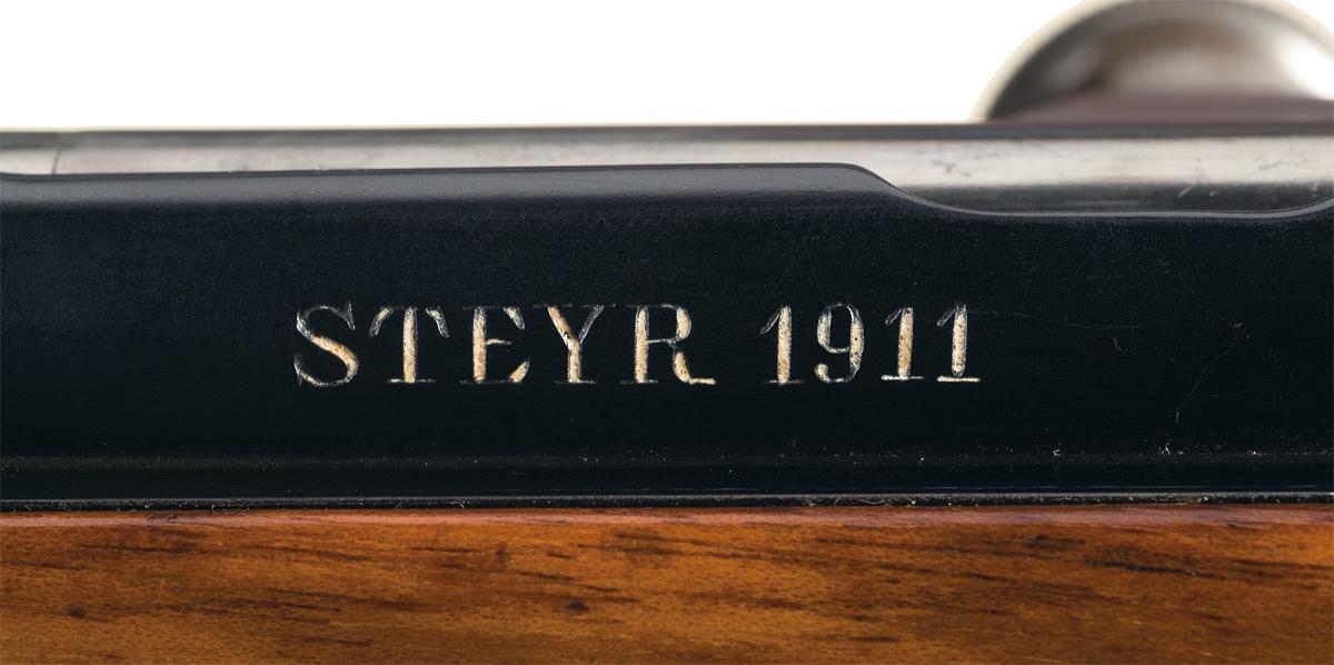 This unique experimental Steyr carbine utilizes an action very similar to the Mauser G41(M) action and gas system. The only visible markings is "STEYR 1911" (highlighted in gold) on the left receiver wall. The barrel is equipped with a ramped blade front sight and two leaf (one folding, one stationary) rear sight. The safety is mounted on the trigger guard plate directly ahead of the trigger guard. The carbine is mounted with a one piece Mannlicher style checkered pistol grip stock with a horn grip cap, metal buttplate with compartment and sling swivel. The front sling swivel has been removed.