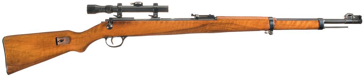 Ramp blade and tangent sights, with banner, model and caliber markings on the barrel and script address on top of the receiver. Smooth pistol grip stock, with a brown leather sling and a flat buttplate. Fitted with a front sight/ muzzle protector and an original period lever mount 2 1/2x scope assembly. Nazi 1940 era eagle over "N" commercial proofs present on left side of receiver (forward) and barrel.