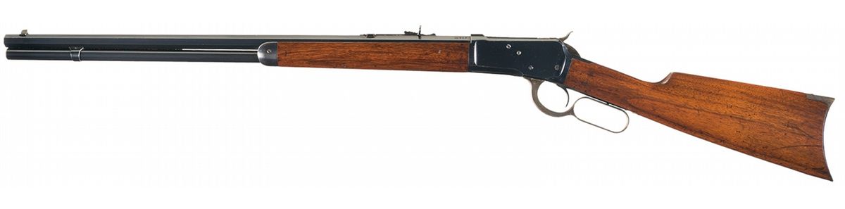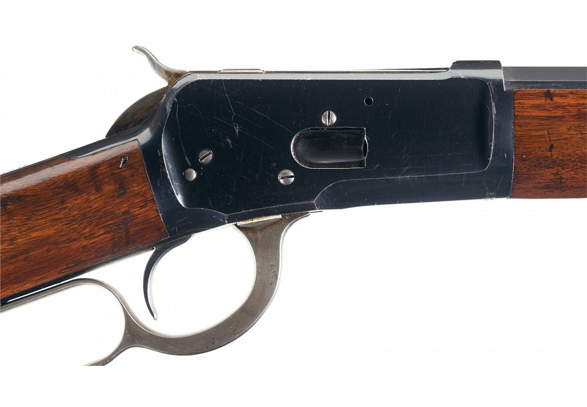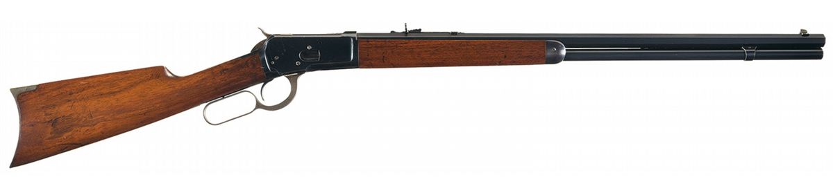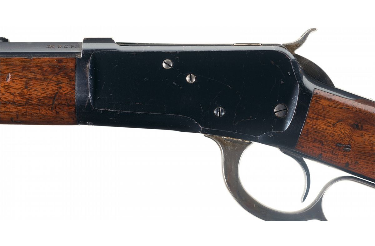 Manufactured in 1909. The top barrel flat is stamped "MANUFACTURED BY THE WINCHESTER REPEATING ARMS CO./NEW HAVEN. CONN. U.S.A. PATENTED OCTOBER 14. 1884", "38 W.C.F." is marked on the upper left flat at the breech and the Winchester oval proof is marked on the top barrel flat and top of the receiver at the breech. The serial number is stamped on the bottom of the receiver. The upper tang is marked "MODEL 1892/--WINCHESTER--/TRADE MARK REG. IN U.S. PAT. OFF." Dovetailed blade front and adjustable buckhorn rear sights, blue finish with casehardened hammer, lever and buttplate, and mounted on a smooth walnut forearm and straight grip stock with a steel crescent buttplate.
