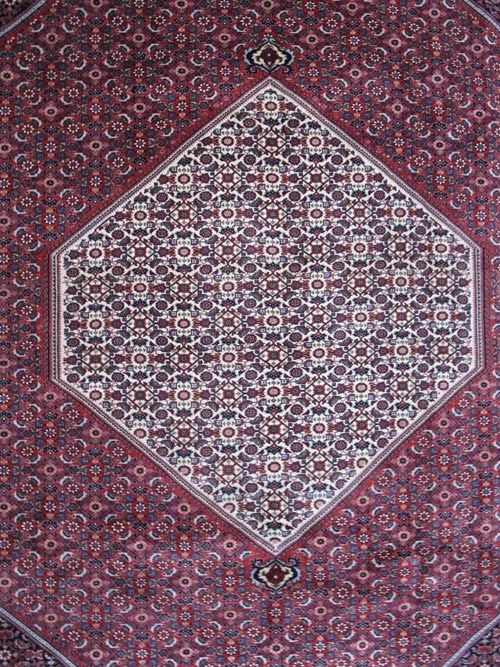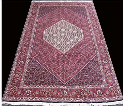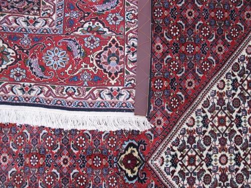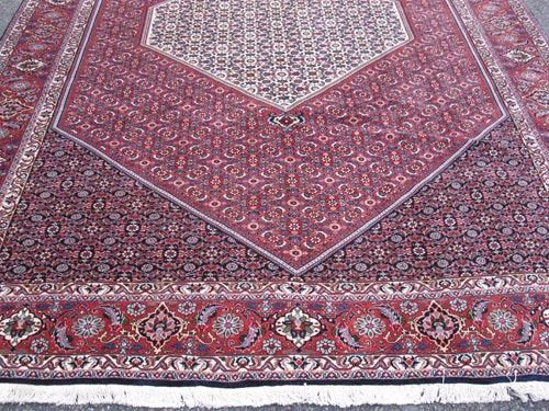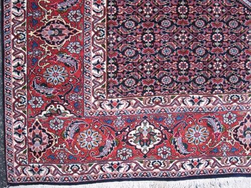 Spectacular rare fish design Persian tak-ab bidjar rug. 100%natural, hand woven, vegetable dye, finest baby lamb's wool pile on cotton foundation. This stunning piece is masterfully hand woven by a master weaver due to the intricate sylized fish design that involves and requires the expertise of a highly trained professional weaver. This lovely piece dates back to pre-revolution, but of course in mint condition. Rugs produced pre-revolution had by far higher standard of quality. Also, generally speaking, it is rather rare to come across tak-ab bidjars in the marketplace, in that very few pieces are ever woven in this village within the proximity of the town of bidjar. This lustrous piece is of such a high quality and compact weave that no other rug can match or surpass it. Please notice that also attesting to the fine weave is the fact that the back of the rug looks as good as the front. This piece has about 200 knots per square inch and it takes over three years to create this beauty. bidjar is a small Kurdish town in the north western part of Iran. The name bidjar denotes the meaning of durability to many carpet specialists. The weaver uses their heavy metal combs, to beat the weft and the knots, to the point that the pile almost stands up. The leather band sewn on the edge at the back of this rug is to keep the edges from curling under due to the extreme tightness of the weave. Size: 11 feet 7 inches X 8 feet 3 inches. Country of Origin: Iran.