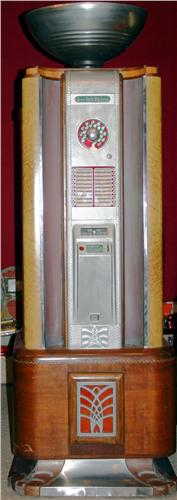 Spectorvox column speaker that connects to a hidden remote player (Lot #1535) that holds the records. Sound is produced in top speaker. Nice original condition.