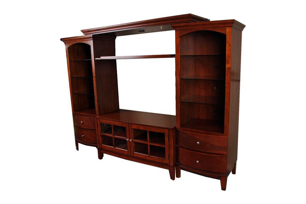 Spectrum Cherry Entertainment Center One switch lighting for easy operation of light fixtures, removable back panels for easy access to components, felt lined drawers, expandable shelf to fit up to a 60" television, overall wall length is 94"-106", wallOne switch lighting for easy operation of light fixtures, removable back panels for easy access to components, felt lined drawers, expandable shelf to fit up to a 60" television, overall wall length is 94"-106", wall height at center of bridge is74", each pier 27"W x 20"D x 71"H. In overall good condition.