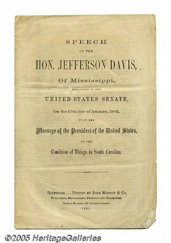 <B>Speech of the Hon. Jefferson Davis of Mississippi, Delivered in the United States Senate....the Condition of Things in South Carolina</B></I> Printed by John Murphy & Co., Baltimore in 1861, 16 pages, uncut shows only light age. One of Jeffeson Davis' more important speeches, delivered on January 10, 1861, the day after Mississippi seceded, ten days before Davis left the Senate, and just a month prior to his becoming President of the Confederacy. A passionate discourse typical for the speaker: <I>"Did the States agree they never could withdraw from the Federal Union?"</B></I> This document sets the record for the inevitability of what followed. We could only source two copies held in institutions. A similar "final address from the Senate," by Judah Benjamin, sold at Christie's last year for $5,000. While that appealed to the Judaica market, this is far more significant and rare. Lot:258