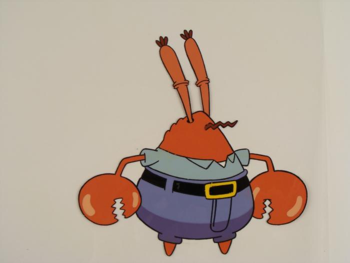 This original animation cel is from the Nickelodeon TV show SpongeBob Squarepants. The story takes place under the deep blue sea in Bikini Bottom, where SpongeBob resides. SpongeBob, who is a yellow, porous sponge, is your typical happy-go-lucky character, as he is always cheerful and enjoys making people laugh. Patrick Star, SpongeBob's neighbor who is a starfish, is your average children's show idiot, as he boasts knowing nothing and is often getting himself into ridiculous situations. Between the homes of these two lies the home of the miserable Squidward, a squid, who is known for being grouchy and playing tricks on SpongeBob and Patrick. Both SpongeBob and Squidward work at the Krusty Krab, a fast food business run by the greedy money-loving Mr. Krabs, a crab, the arch rival of the evil, possibly misunderstood, Plankton. Another neighbor, Sandy Cheeks, an athletic squirrel who normally wears an astronaut's space suit, was introduced in "Tea at the Treedome." She spends most of her time inventing and experimenting. Shown here is SpongeBob's pet, Gary the snail.Here Mr. Krabs is literally speechless. He doesn't even have a mouth to speak with.Original Production Animated Cel Overall Size of Cel: 10 1/2" x 12 1/2" Excellent ConditionThis is an original hand-painted cel set-up used in the production of an episode of "SpongeBob SquarePants." Each one-of-a-kind set-up represents a slight change in position of the characters. When individually photographed and projected in rapid succession, the images appear to move.