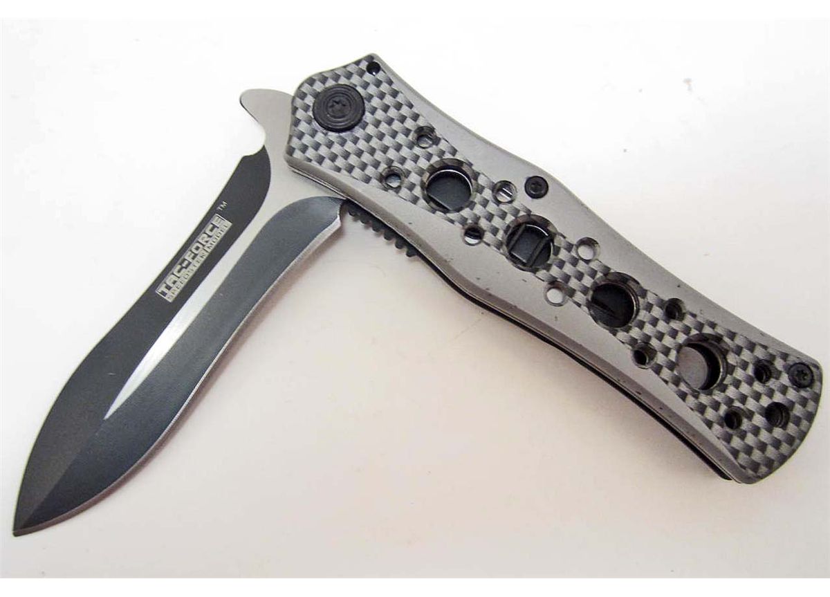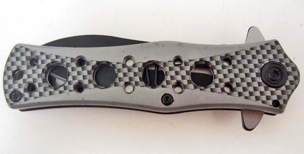 4" closed. 3 1/8" stainless assisted opening Two (2) tone black and silver spear point blade with extended tang. Gray aluminum handle with carbon fiber inlay of front and black coated aluminum handle on back. Lanyard hole. Black stainless pocket clip with drilled hole design.