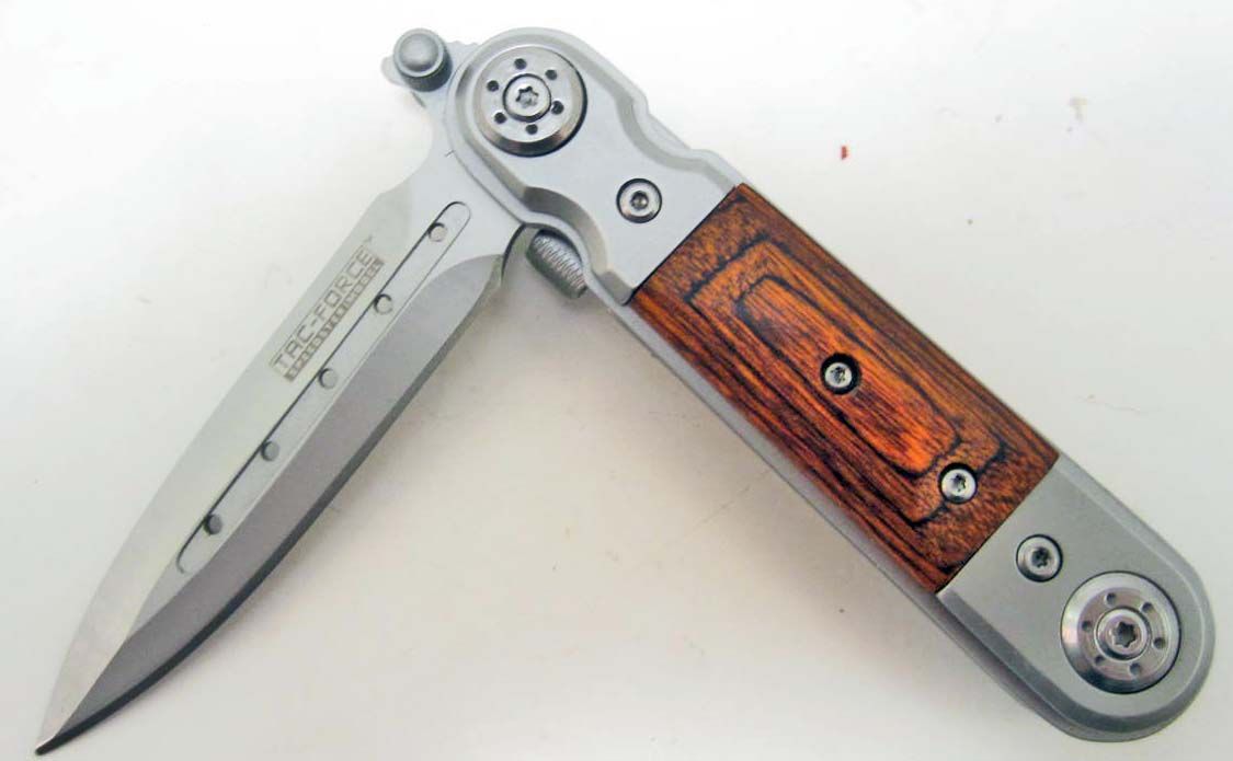 4" closed. 3" matte finish assisted opening blade with dual thumb studs and dual extended tangs. Matte finish stainless frame with brown wood onlay scales and matte finish bolsters. Matte finish stainless pocket clip.