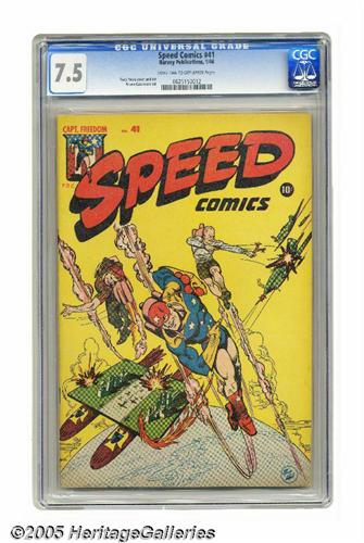 <B>Speed Comics #41 (Harvey, 1946) CGC VF- 7.5 Light tan to off-white pages.</B></I> Rudy Palais cover. Palais and Arturo Cazeneuve art. From the Harvey files. Overstreet 2005 VF 8.0 value = $268. CGC census 3/05: 1 in 7.5, 1 higher.