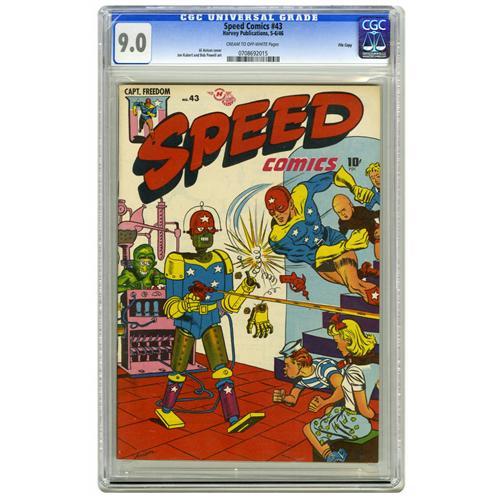 <B>Speed Comics #43 File Copy (Harvey, 1946) CGC VF/NM 9.0 Cream to off-white pages.</B></I> Attention "robot cover" enthusiasts, this Harvey book has a 'bot complete with ray gun, all courtesy of Al Avison. The interior artists include Joe Kubert. Overstreet 2006 VF/NM 9.0 value = $459; NM- 9.2 value = $625. CGC census 4/06: 4 in 9.0, 4 higher.