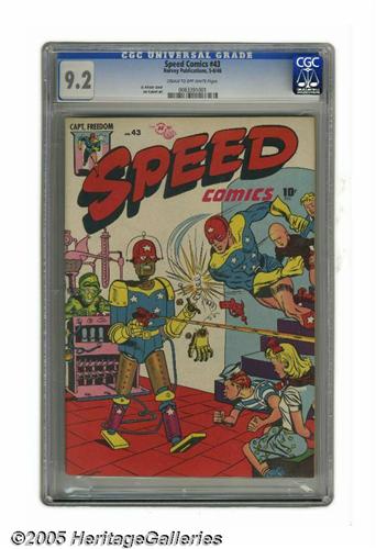 <B>Speed Comics #43 (Harvey, 1946) CGC NM- 9.2 Cream to off-white pages.</B></I> Attention "robot cover" enthusiasts, this Harvey book has a 'bot complete with ray gun, all courtesy of Al Avison. The interior artists include Joe Kubert. Only one copy of this issue has been certified with a higher grade by CGC to date. Overstreet 2005 NM- 9.2 value = $600. CGC census 12/04: 3 in 9.2, 1 higher. CGC census 3/05: 3 in 9.2, 1 higher.