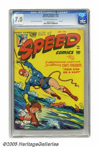 <B>Speed Comics #44 (Harvey, 1947) CGC FN/VF 7.0 Cream to off-white pages.</B></I> Last issue of the title. Rudy Palais cover. Joe Kubert and Bob Powell art. From the Harvey files. Overstreet 2005 FN 6.0 value = $132; VF 8.0 value = $268. CGC census 3/05: 1 in 7.0, 2 higher.