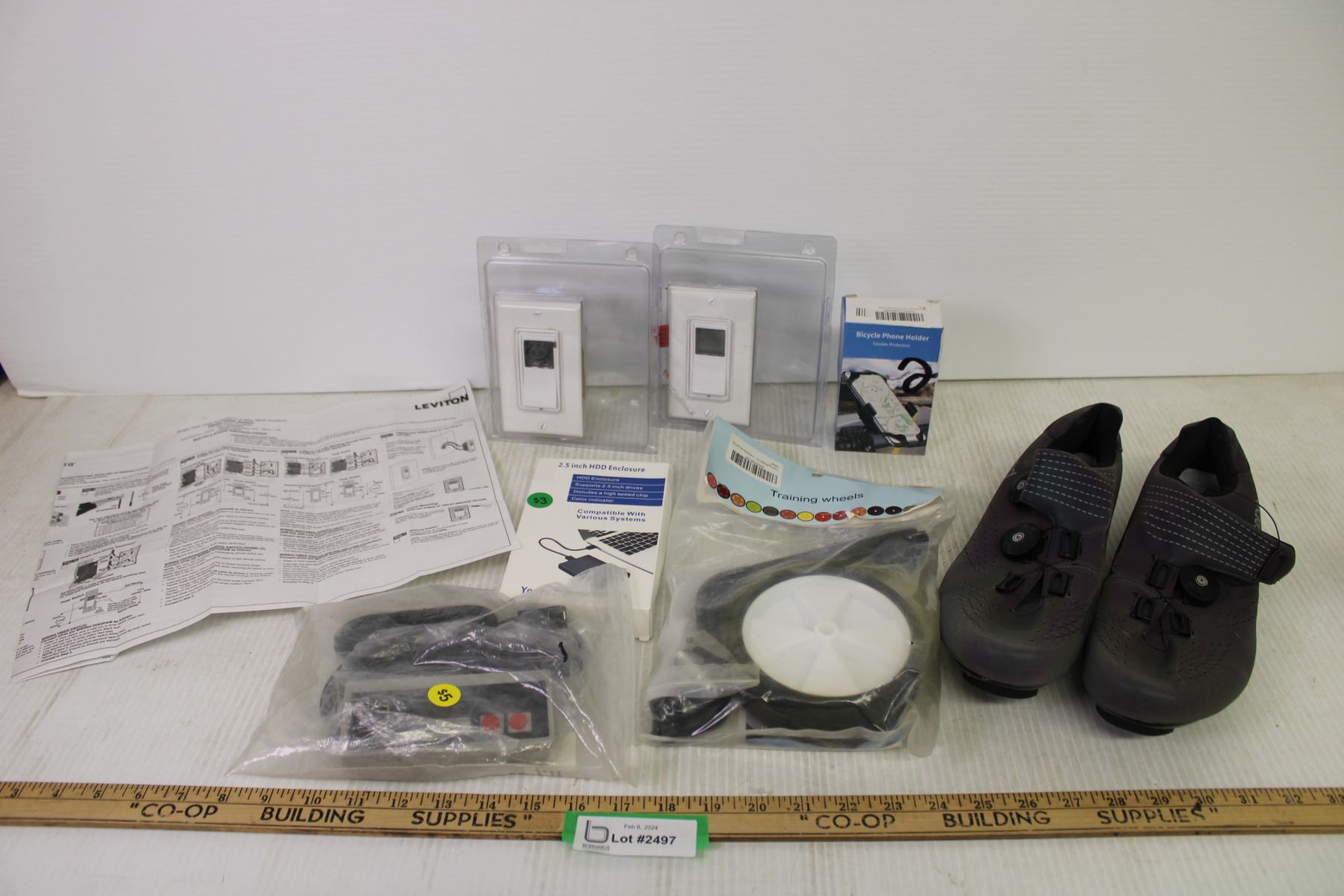 Speed Cycling Shoes - Size 43, (2) Leviton Digital Timer Switches , Training Wheels and Misc.