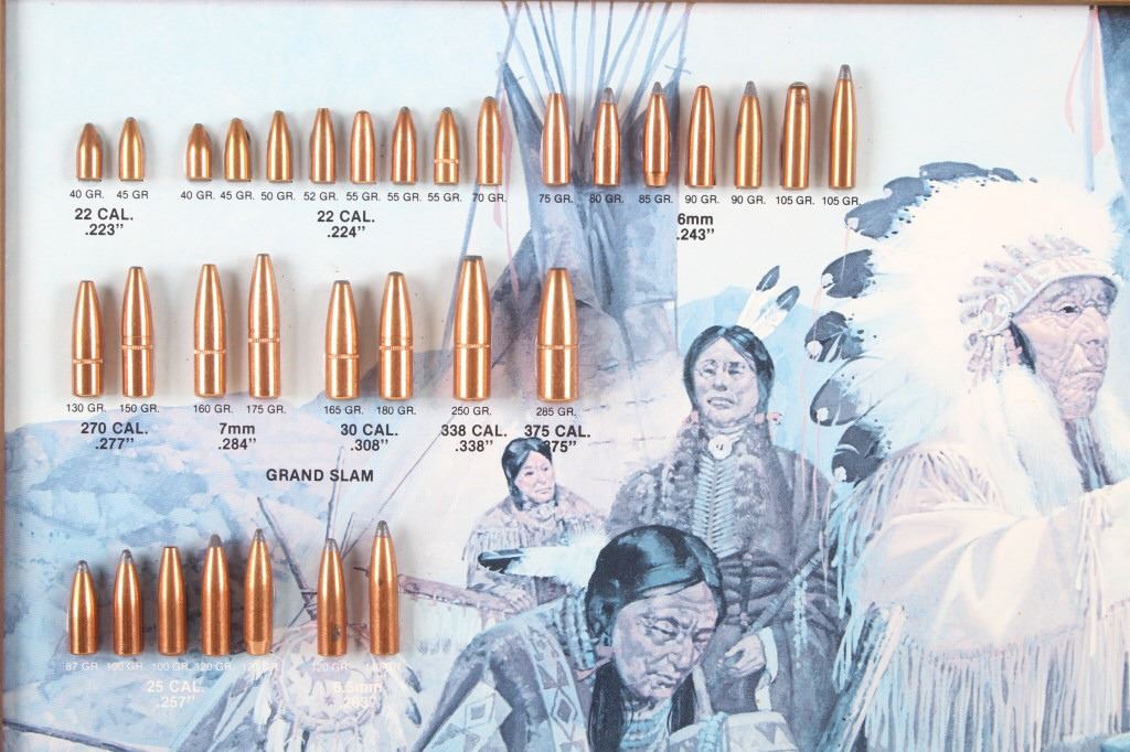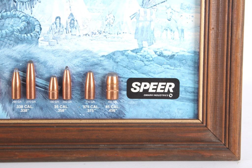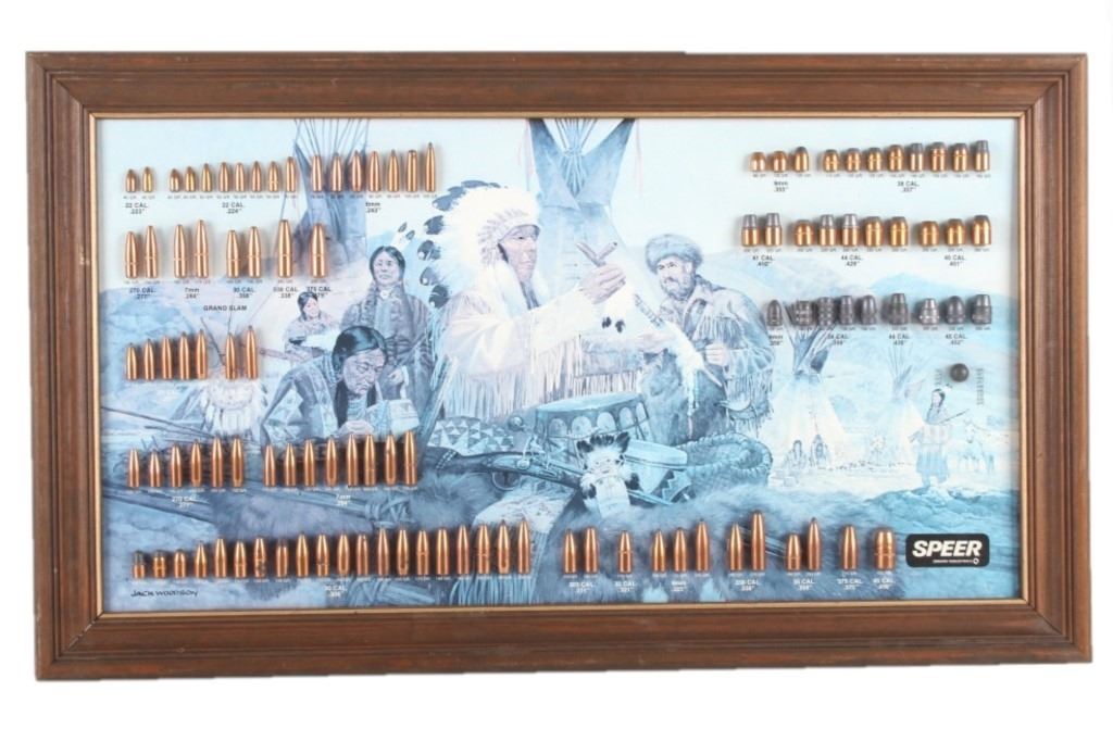 Featured in this lot is this Speer Bullets ordinance display advertisement. This display shows "Potlatch" a painting by Jack Woodson. The painting shows and Indian Chief and a Mountain Man trading. In 1943 Vernon Speer started building bullets because reloaders couldn't get the components they needed from ammo companies during World War II. The company was and is in Lewiston Idaho. The display is a beautiful display of one hundred and nine bullets from .22 Cal to .45 Cal. On the back of the display is a piece telling of the history of the Potlatch and trade with the Native American Indians. The display is in a wood frame. The Condition of this ordinance display is good. The measurements are 24" x 14".
