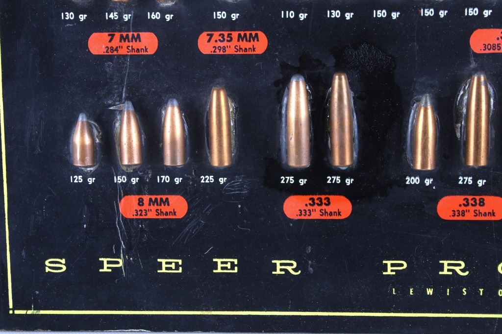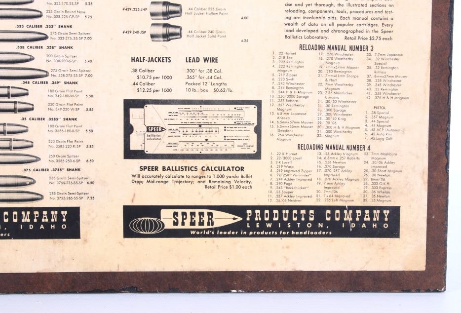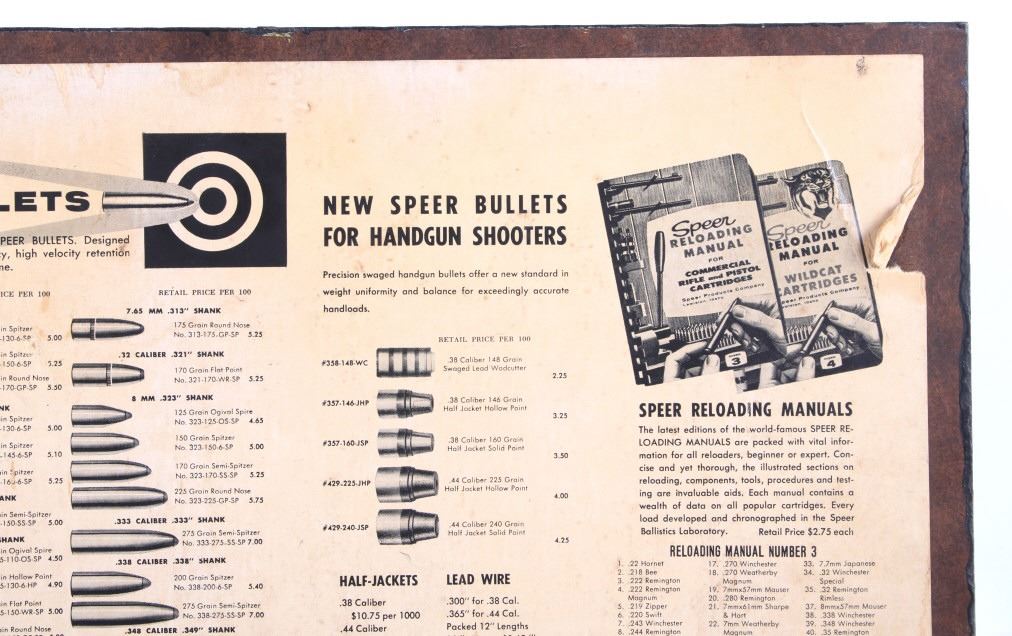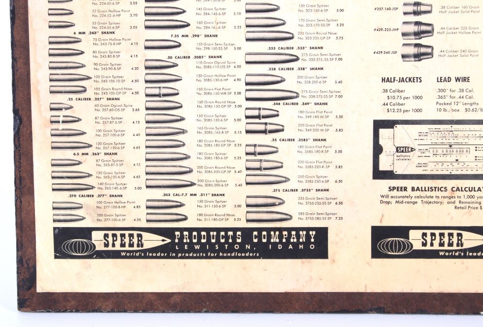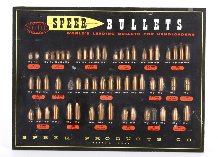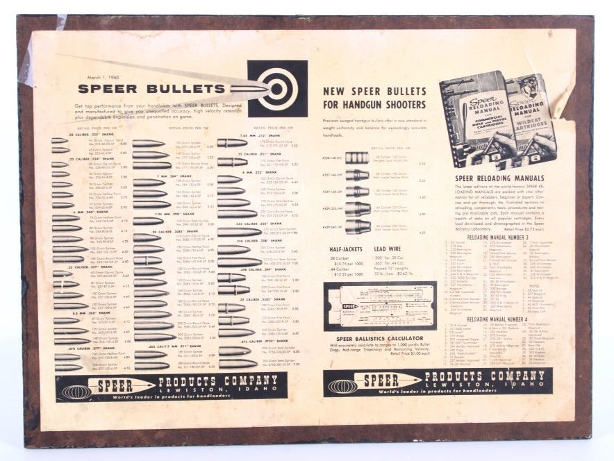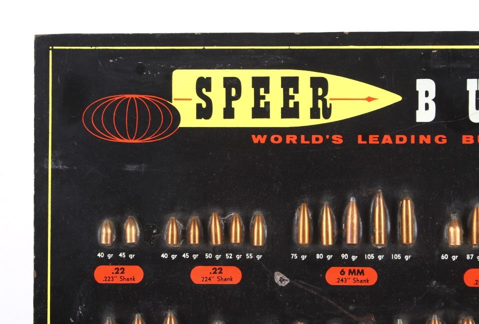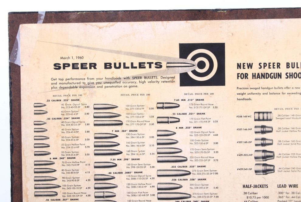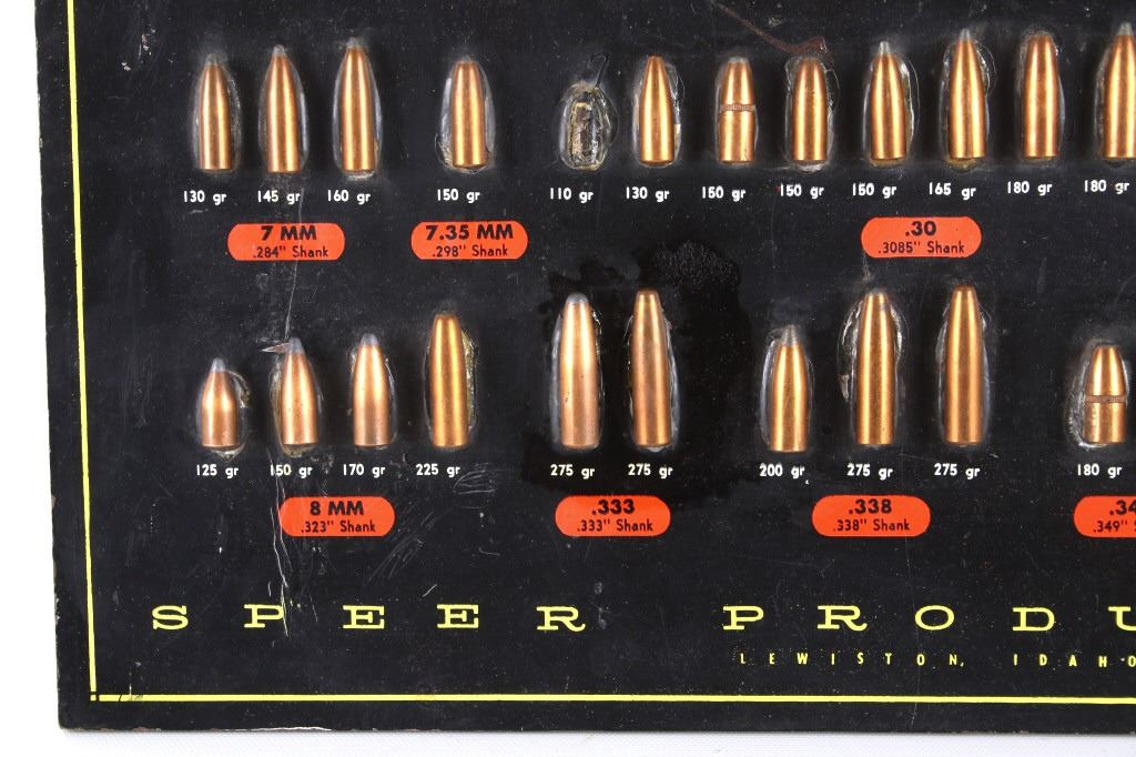 Featured in this lot is this Speer Bullets ordinance display advertisement. In 1943 Vernon Speer started building bullets because reloaders couldn't get the components they needed from ammo companies during World War II. The company was and is in Lewiston Idaho. The display shows a beautiful display of fifty-five bullets from .22 40Gr to 375 285Gr. Two bullets are missing from the display a .30 110Gr and a .35 220Gr. The display is on a painted black board with the Speer name, logo, and bullet information in red, yellow, and white. On the back of the display is a March 1 1960 price and information sheet. The condition of this ordinance display is fair with the note of the two missing rounds, and minor signs of wear and display. The measurements are 16" x 12".