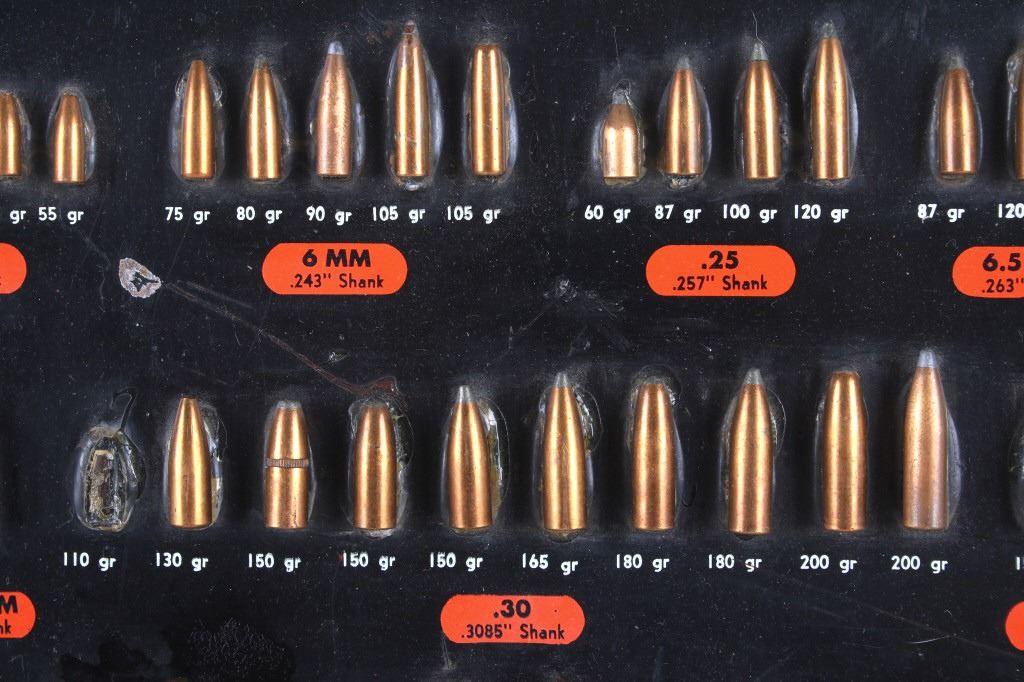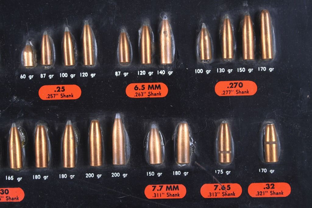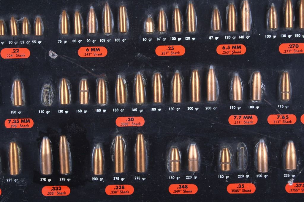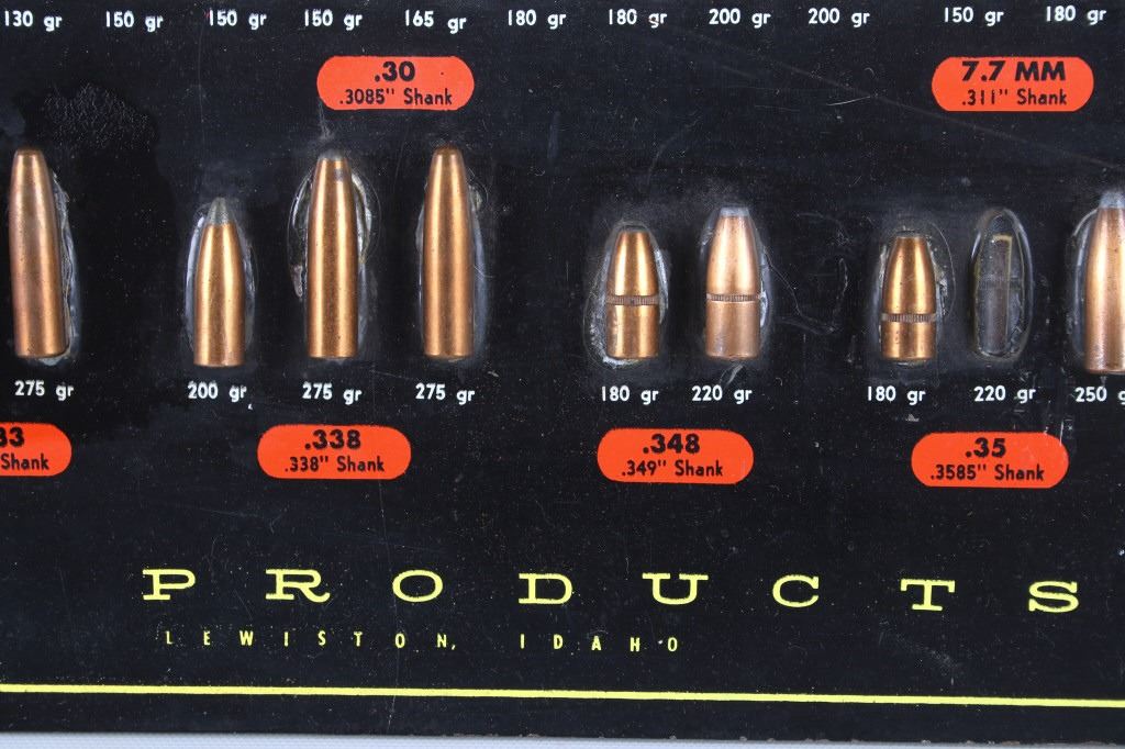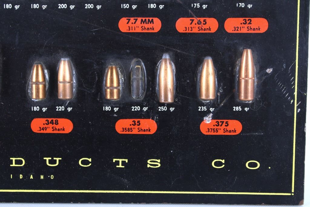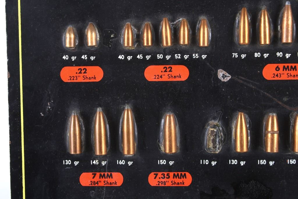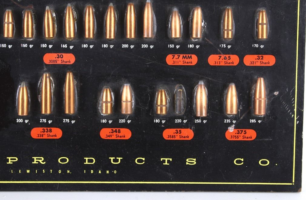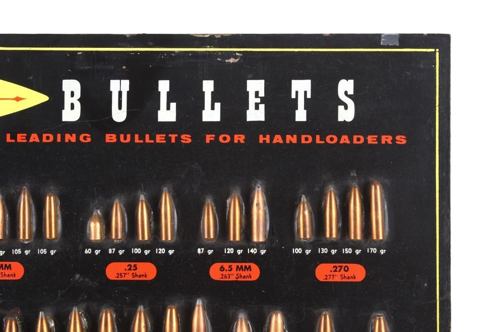 Featured in this lot is this Speer Bullets ordinance display advertisement. In 1943 Vernon Speer started building bullets because reloaders couldn't get the components they needed from ammo companies during World War II. The company was and is in Lewiston Idaho. The display shows a beautiful display of fifty-five bullets from .22 40Gr to 375 285Gr. Two bullets are missing from the display a .30 110Gr and a .35 220Gr. The display is on a painted black board with the Speer name, logo, and bullet information in red, yellow, and white. On the back of the display is a March 1 1960 price and information sheet. The condition of this ordinance display is fair with the note of the two missing rounds, and minor signs of wear and display. The measurements are 16" x 12".