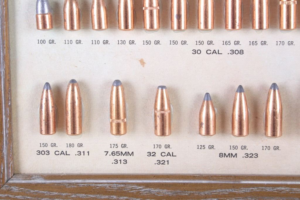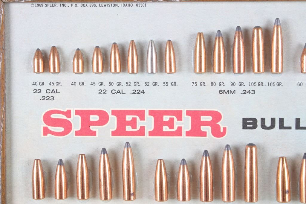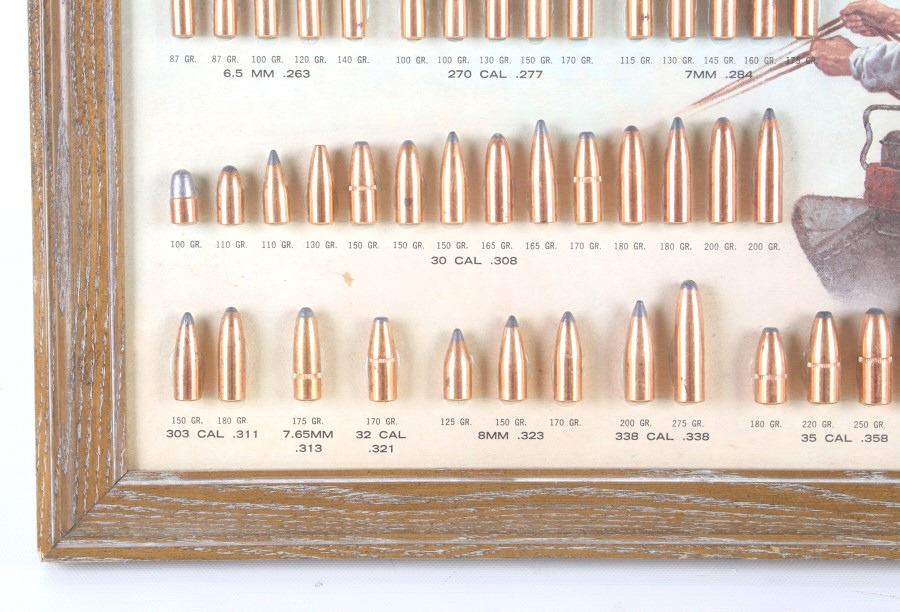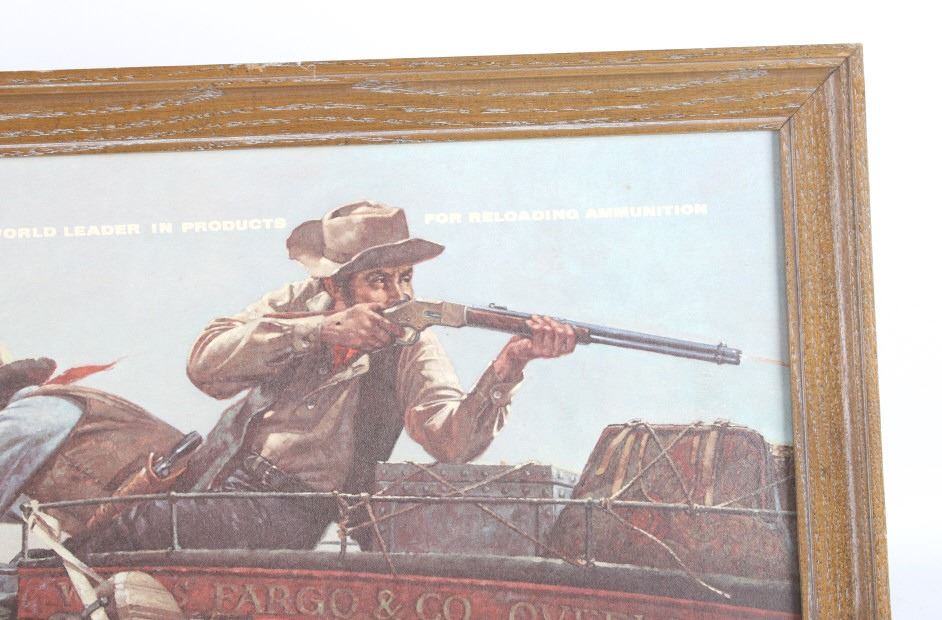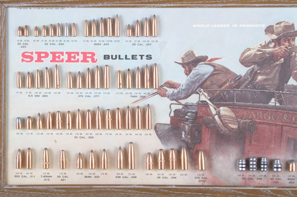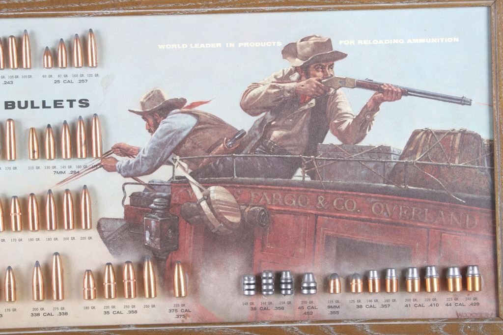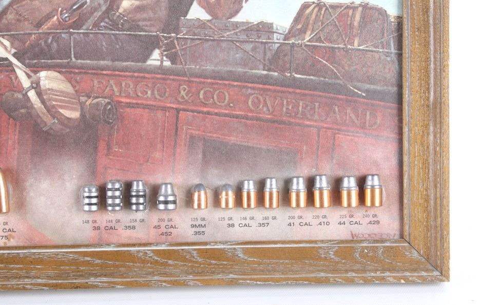 Featured in this lot is this Speer Bullets ordinance display advertisement. This display shows two men on a Wells Fargo stage Coach. In 1943 Vernon Speer started building bullets because reloaders couldn't get the components they needed from ammo companies during World War II. The company was and is in Lewiston Idaho. The display shows a beautiful display of seventy-two bullets from .22 40Gr to 44 Cal .429 240Gr. The display is in a wood frame. The Condition of this ordinance display is good. The measurements are 21" x 11".