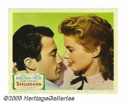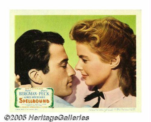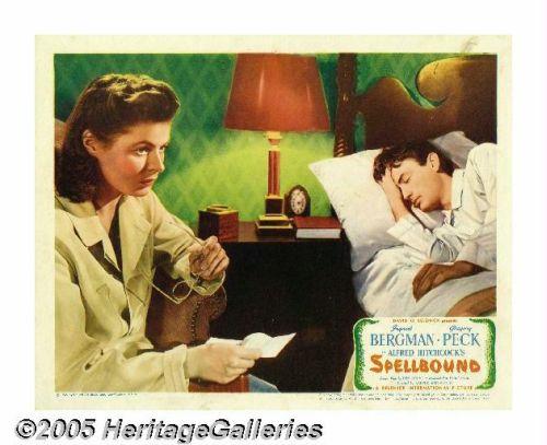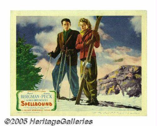 <B>Spellbound (United Artists, 1945).</B></I> Lobby Cards (4) (11" X 14"). No other director captured the psychological melodrama genre as perfectly as Alfred Hitchcock. This <I>film noir</B></I> classic stars Ingrid Bergman as an icy therapist and Gregory Peck as the disturbed man she tries to help. There are a few minor border imperfection and one dark smudge mark on the graphics of the ski scene card. The colors are bright and vibrant and these cards display extremely well.